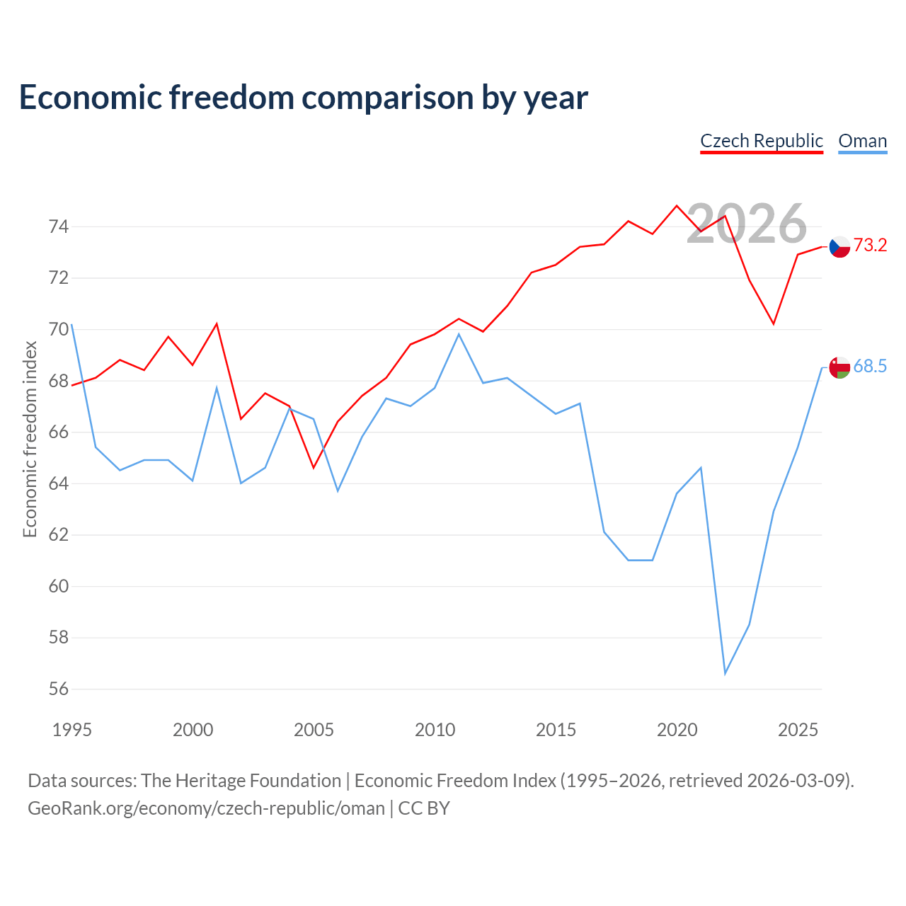 The Economic Freedom Index for the Czech Republic is 73.2, ranking 25/197, compared to 68.5 for Oman, ranking 45/197. The chart above displays a comparison of annual changes in economic freedom indexes.