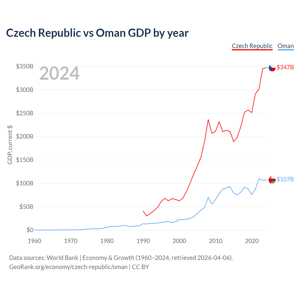 The Czech Republic has a GDP of $347B compared to $107B for Oman, ranking 44/197 and 70/197 by economy size, respectively.