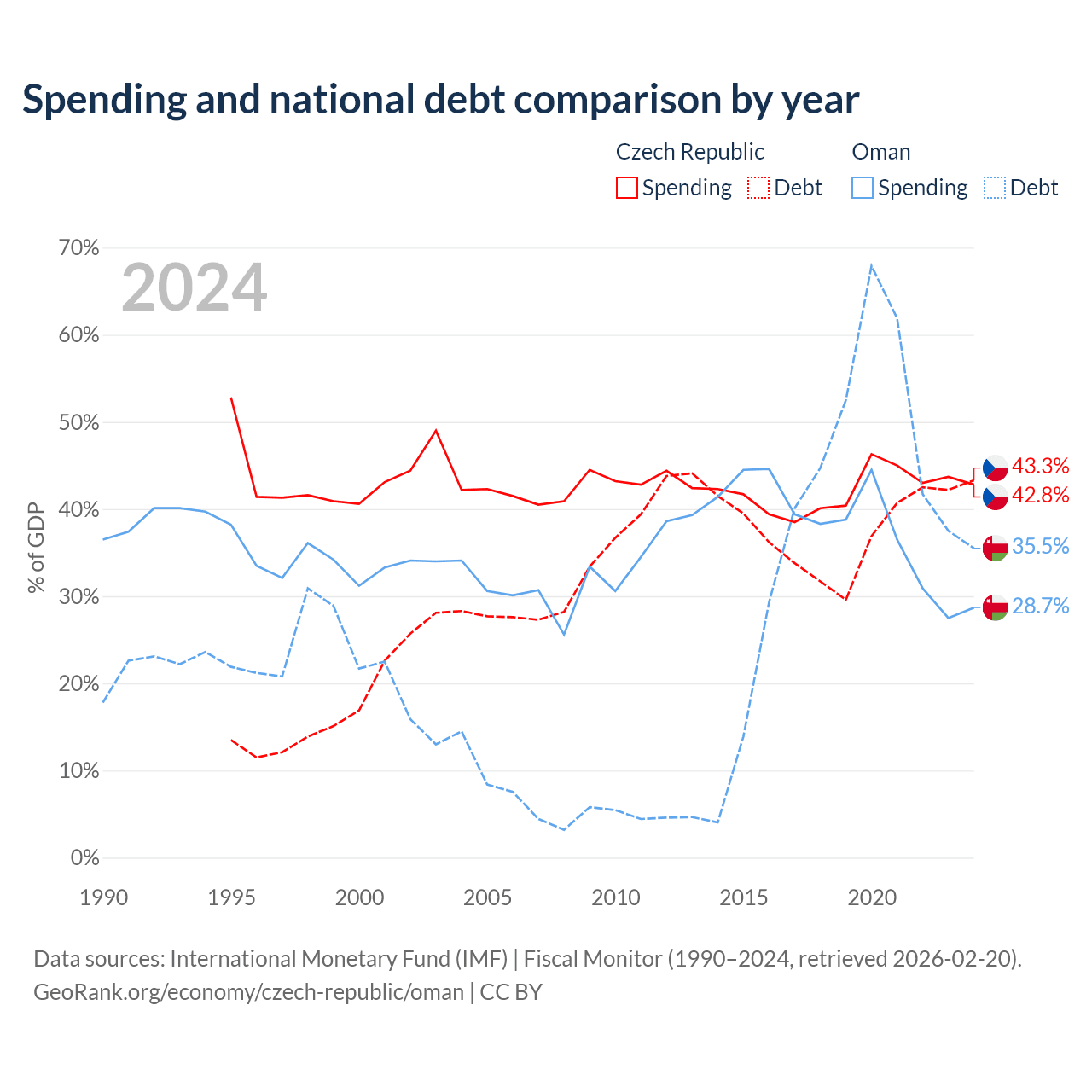 The Czech Republic has $150B in government debt (43.3% of GDP), compared to $38B (35.5% of GDP) in Oman.