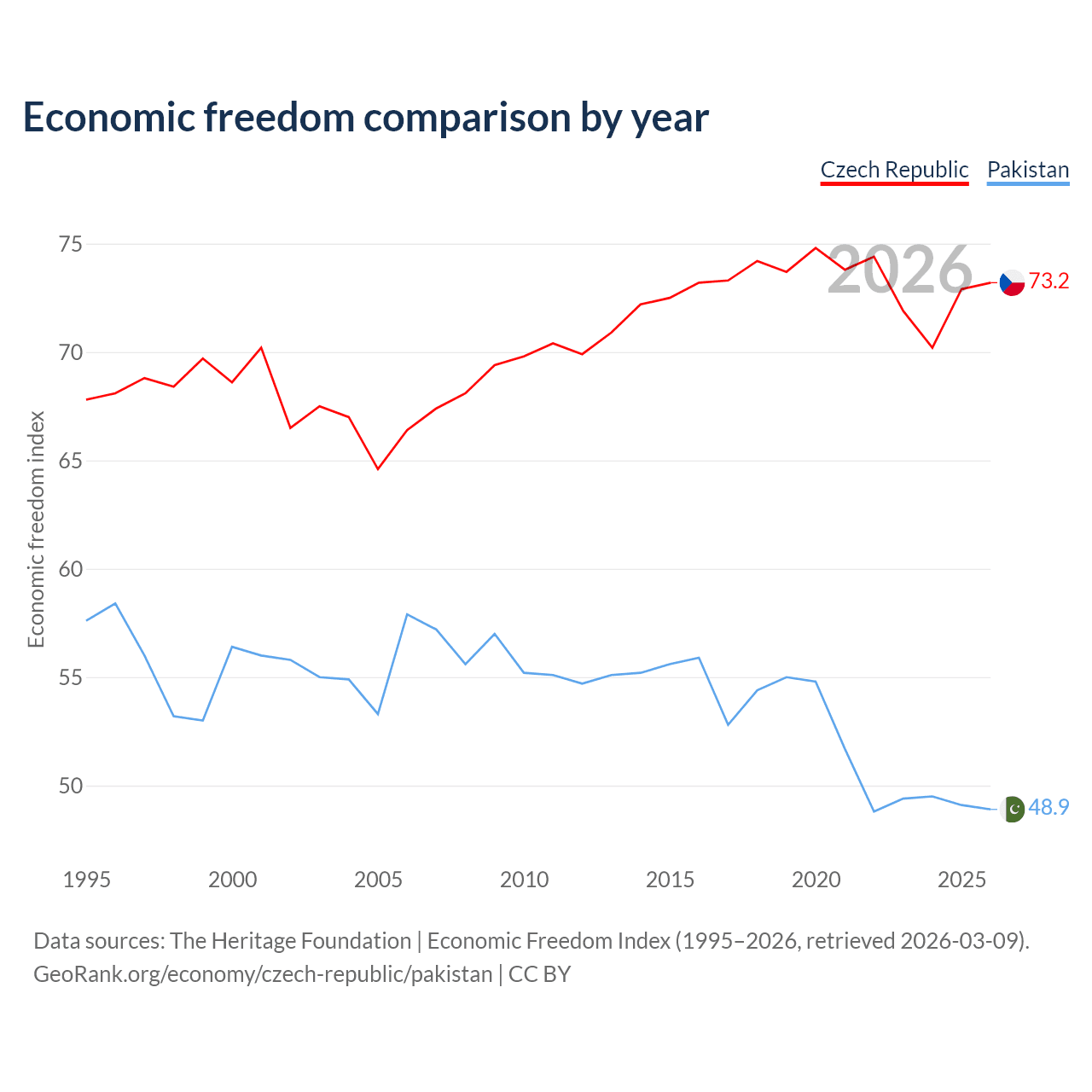 The Economic Freedom Index for the Czech Republic is 73.2, ranking 25/197, compared to 48.9 for Pakistan, ranking 168/197. The chart above displays a comparison of annual changes in economic freedom indexes.