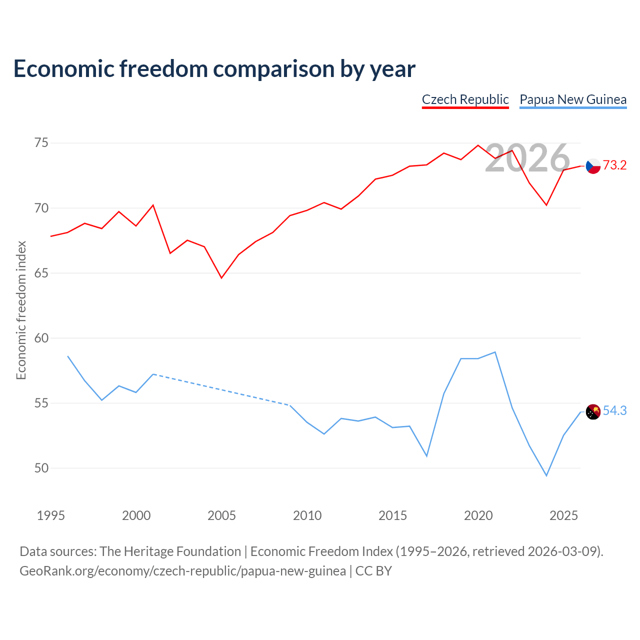 The Economic Freedom Index for the Czech Republic is 73.2, ranking 25/197, compared to 54.3 for Papua New Guinea, ranking 134/197. The chart above displays a comparison of annual changes in economic freedom indexes.