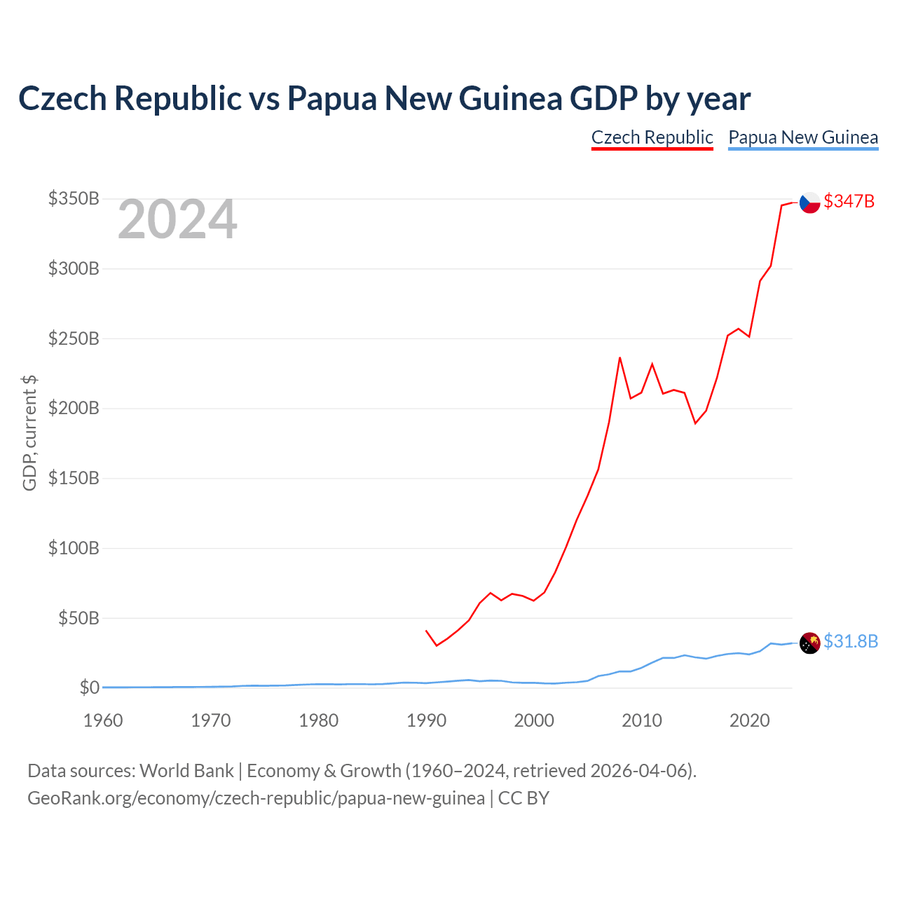 The Czech Republic has a GDP of $347B compared to $31.8B for Papua New Guinea, ranking 44/197 and 110/197 by economy size, respectively.