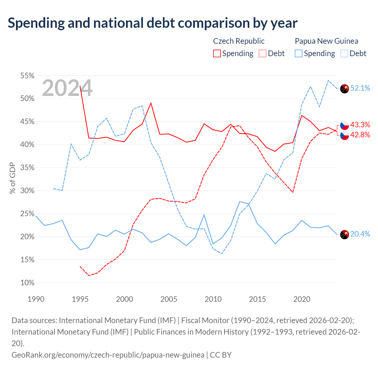 The Czech Republic has $150B in government debt (43.3% of GDP), compared to $16.6B (52.1% of GDP) in Papua New Guinea.