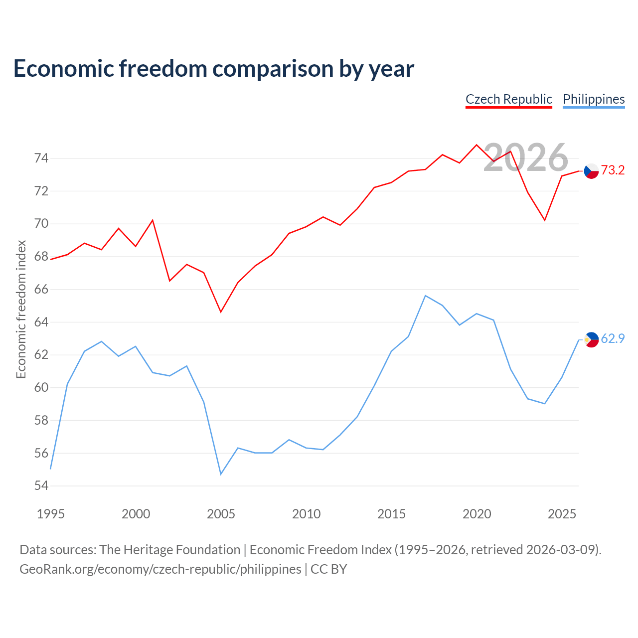 The Economic Freedom Index for the Czech Republic is 73.2, ranking 25/197, compared to 62.9 for the Philippines, ranking 85/197. The chart above displays a comparison of annual changes in economic freedom indexes.