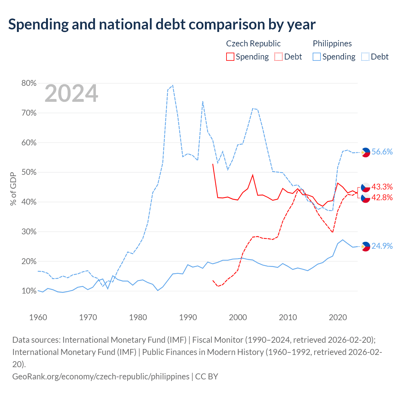 The Czech Republic has $150B in government debt (43.3% of GDP), compared to $261B (56.6% of GDP) in the Philippines.