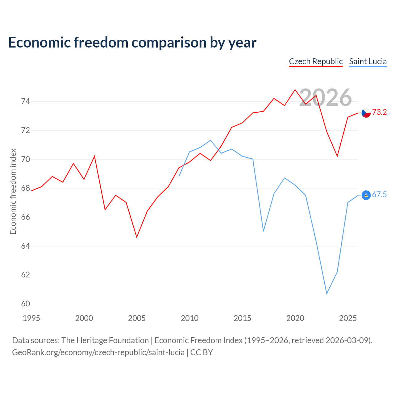 The Economic Freedom Index for the Czech Republic is 73.2, ranking 25/197, compared to 67.5 for Saint Lucia, ranking 57/197. The chart above displays a comparison of annual changes in economic freedom indexes.