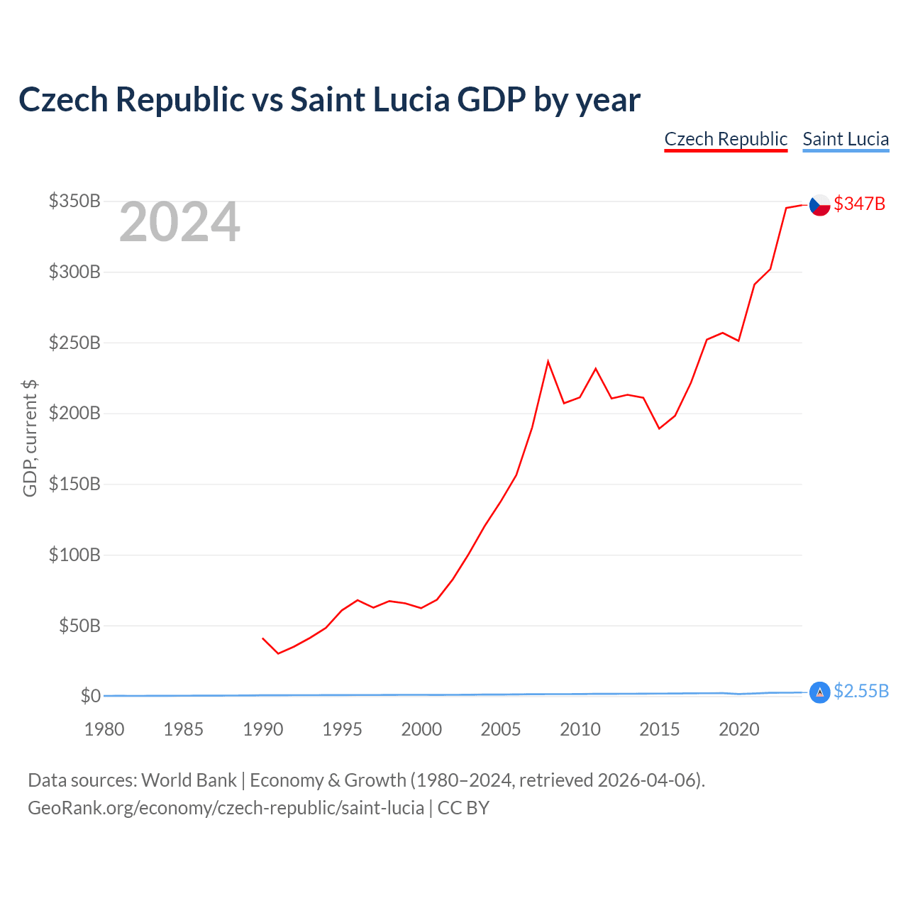 The Czech Republic has a GDP of $347B compared to $2.55B for Saint Lucia, ranking 44/197 and 173/197 by economy size, respectively.