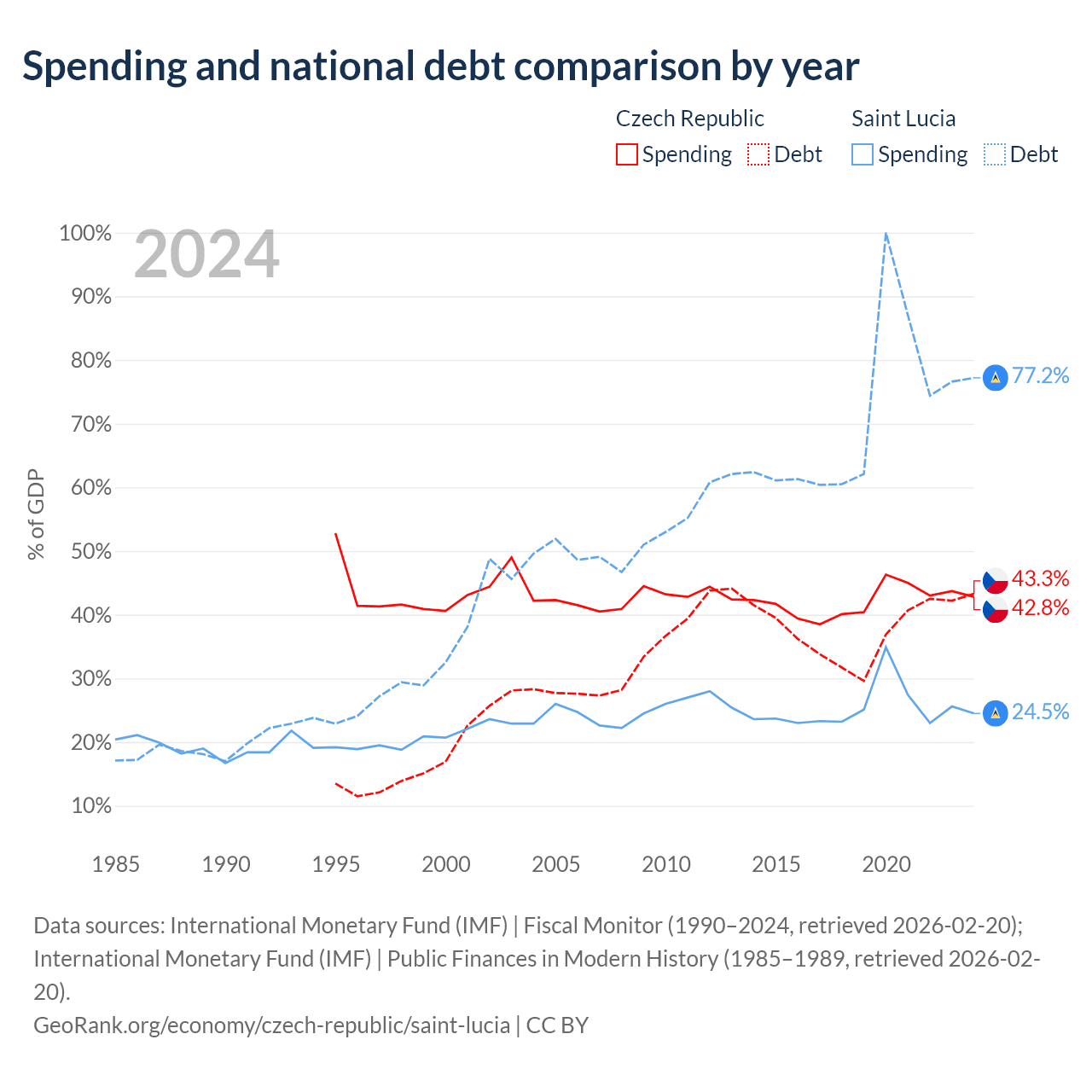 The Czech Republic has $150B in government debt (43.3% of GDP), compared to $1.97B (77.2% of GDP) in Saint Lucia.