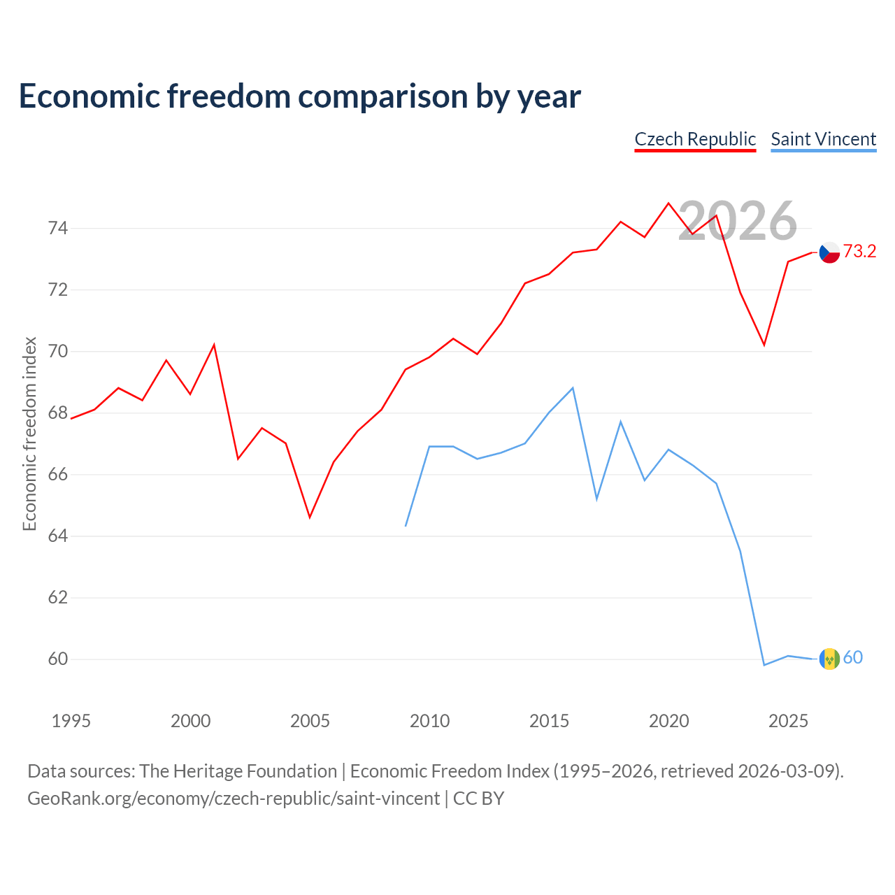 The Economic Freedom Index for the Czech Republic is 73.2, ranking 25/197, compared to 60 for Saint Vincent, ranking 98/197. The chart above displays a comparison of annual changes in economic freedom indexes.