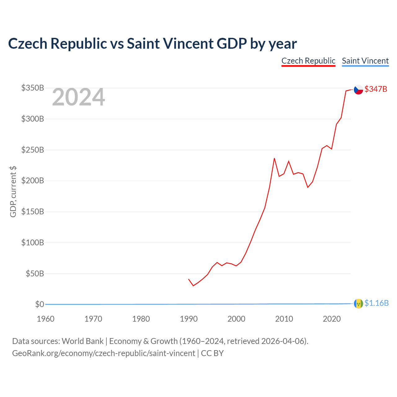 The Czech Republic has a GDP of $347B compared to $1.16B for Saint Vincent, ranking 44/197 and 186/197 by economy size, respectively.