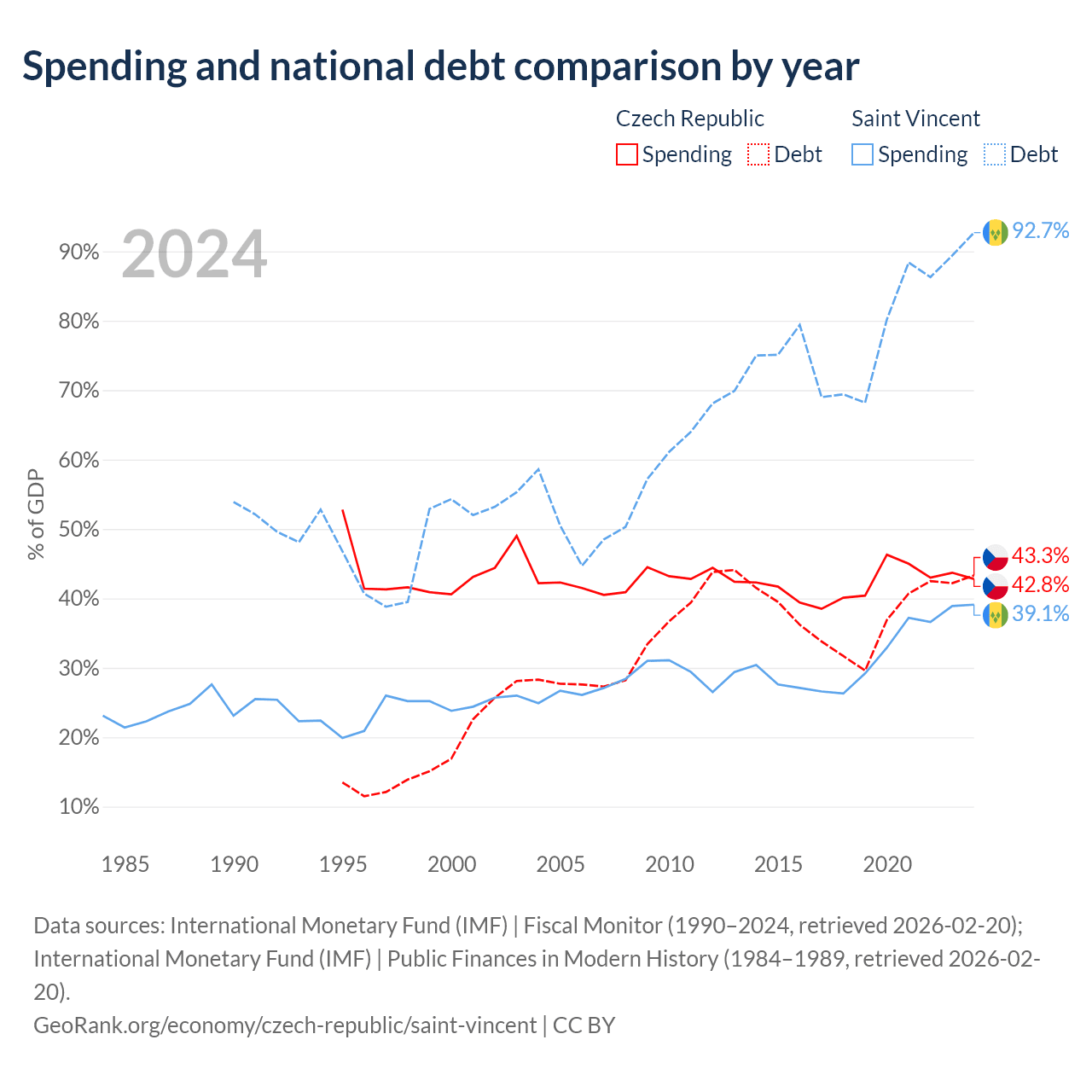 The Czech Republic has $150B in government debt (43.3% of GDP), compared to $1.07B (92.7% of GDP) in Saint Vincent.