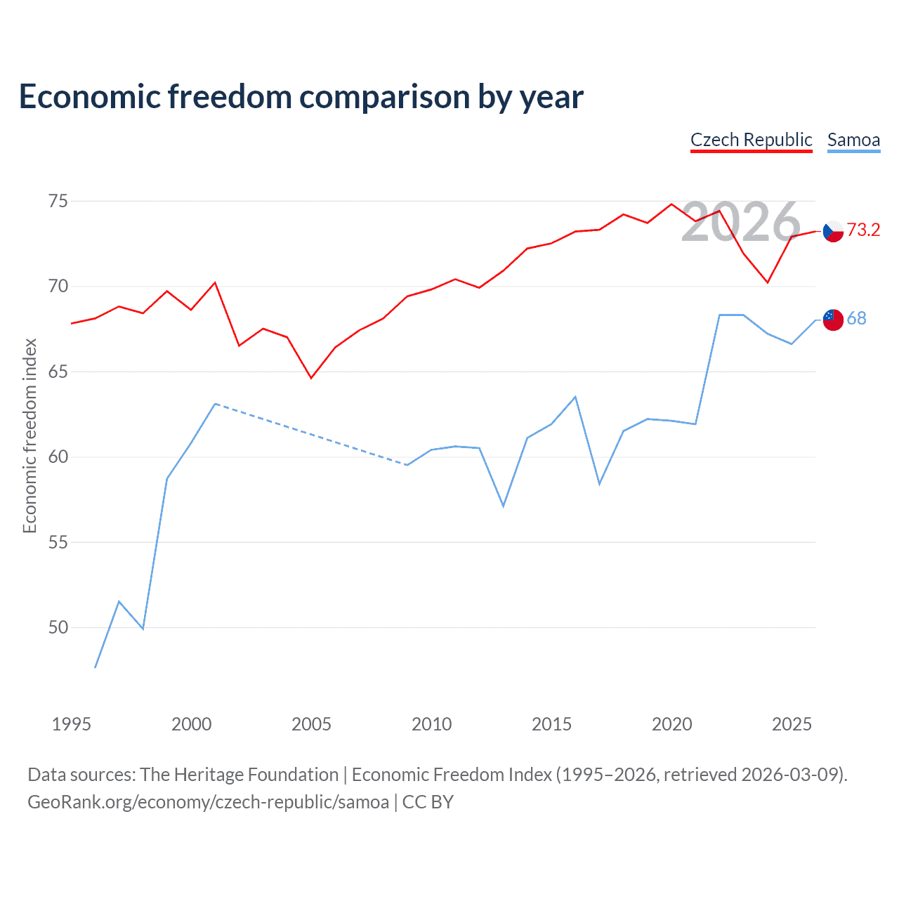 The Economic Freedom Index for the Czech Republic is 73.2, ranking 25/197, compared to 68 for Samoa, ranking 52/197. The chart above displays a comparison of annual changes in economic freedom indexes.