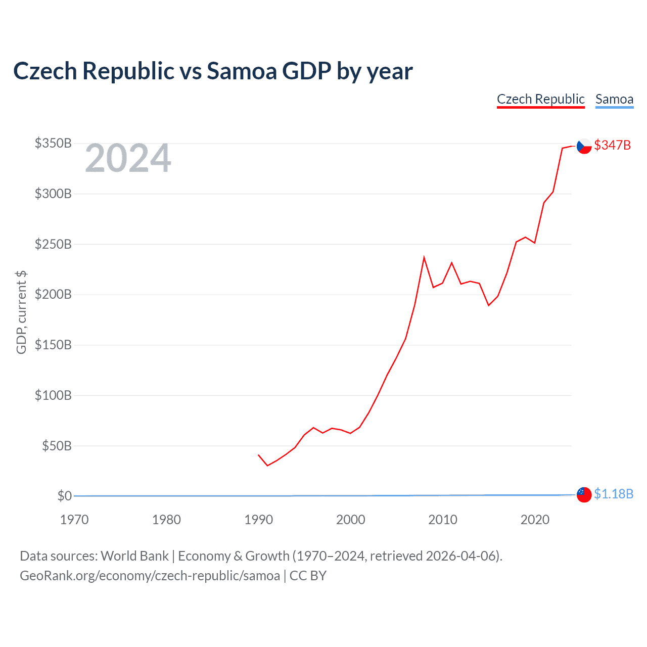 The Czech Republic has a GDP of $347B compared to $1.18B for Samoa, ranking 44/197 and 185/197 by economy size, respectively.
