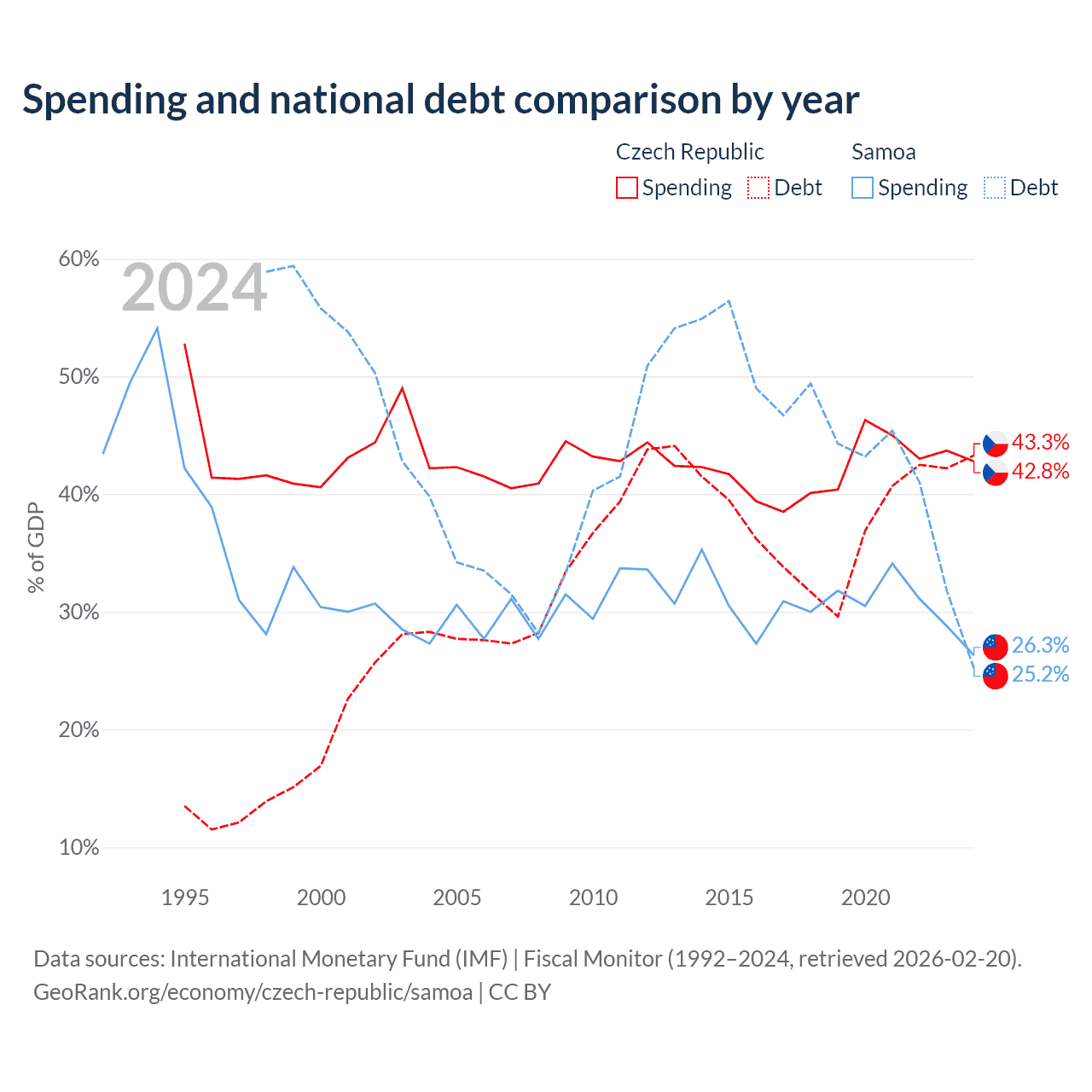 The Czech Republic has $150B in government debt (43.3% of GDP), compared to $296M (25.2% of GDP) in Samoa.