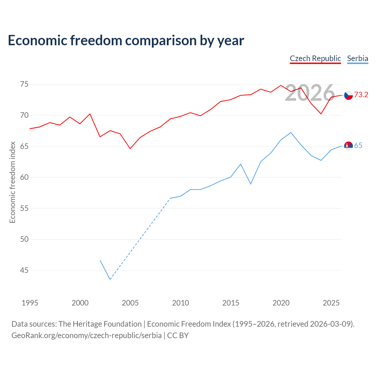 The Economic Freedom Index for the Czech Republic is 73.2, ranking 25/197, compared to 65 for Serbia, ranking 68/197. The chart above displays a comparison of annual changes in economic freedom indexes.