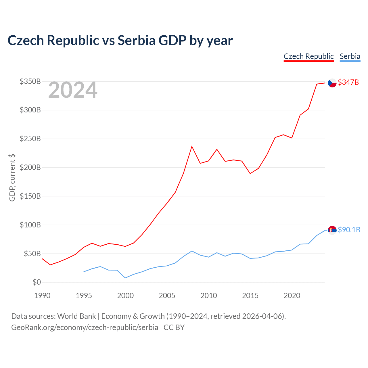 The Czech Republic has a GDP of $347B compared to $90.1B for Serbia, ranking 44/197 and 76/197 by economy size, respectively.