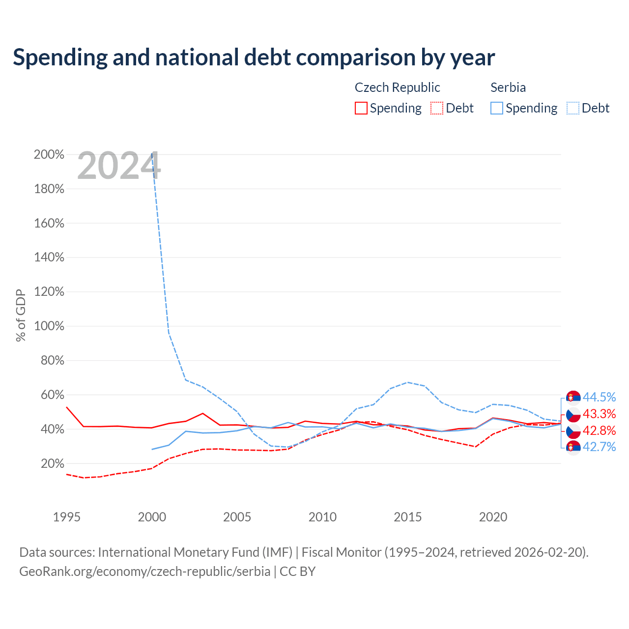 The Czech Republic has $150B in government debt (43.3% of GDP), compared to $40.1B (44.5% of GDP) in Serbia.