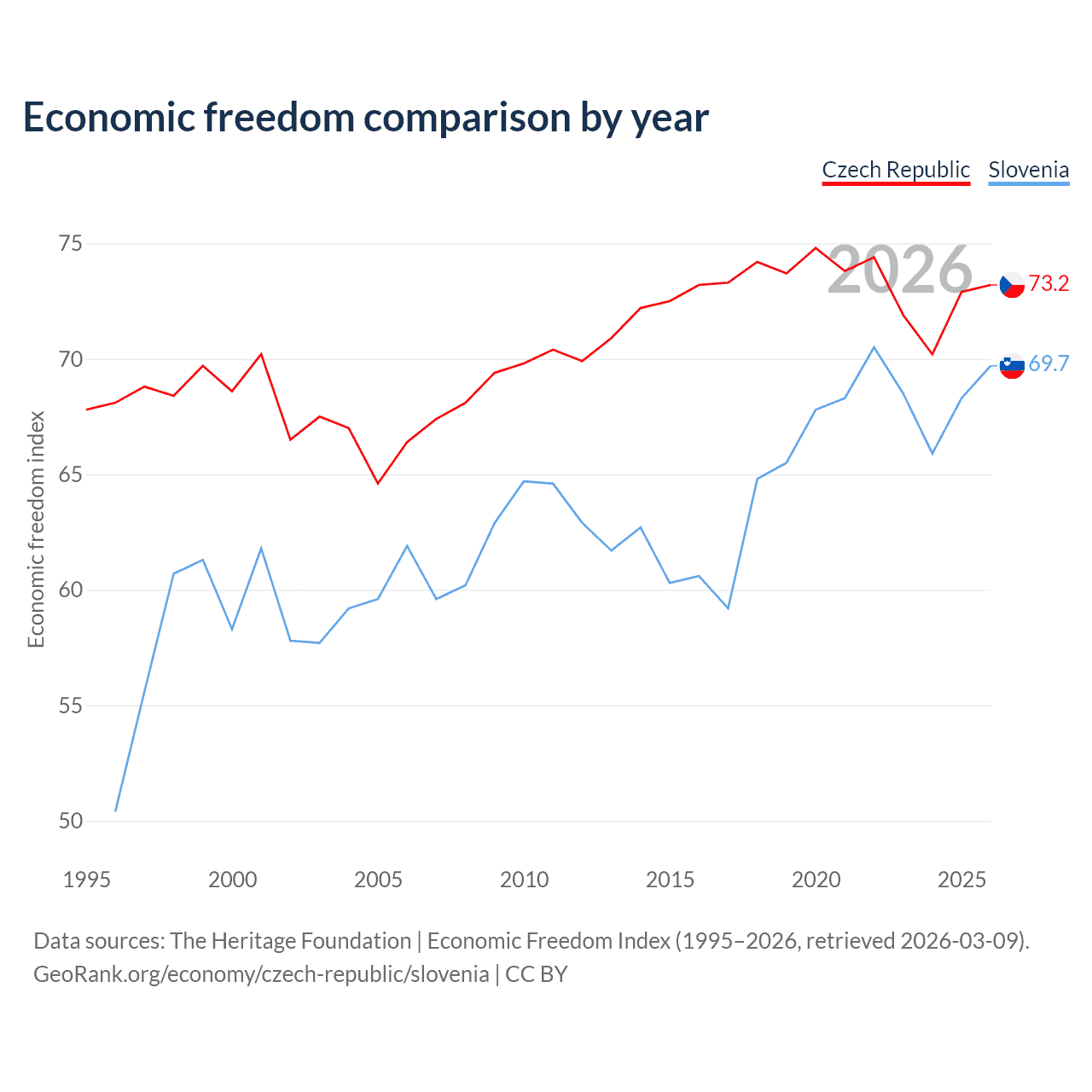 The Economic Freedom Index for the Czech Republic is 73.2, ranking 25/197, compared to 69.7 for Slovenia, ranking 40/197. The chart above displays a comparison of annual changes in economic freedom indexes.