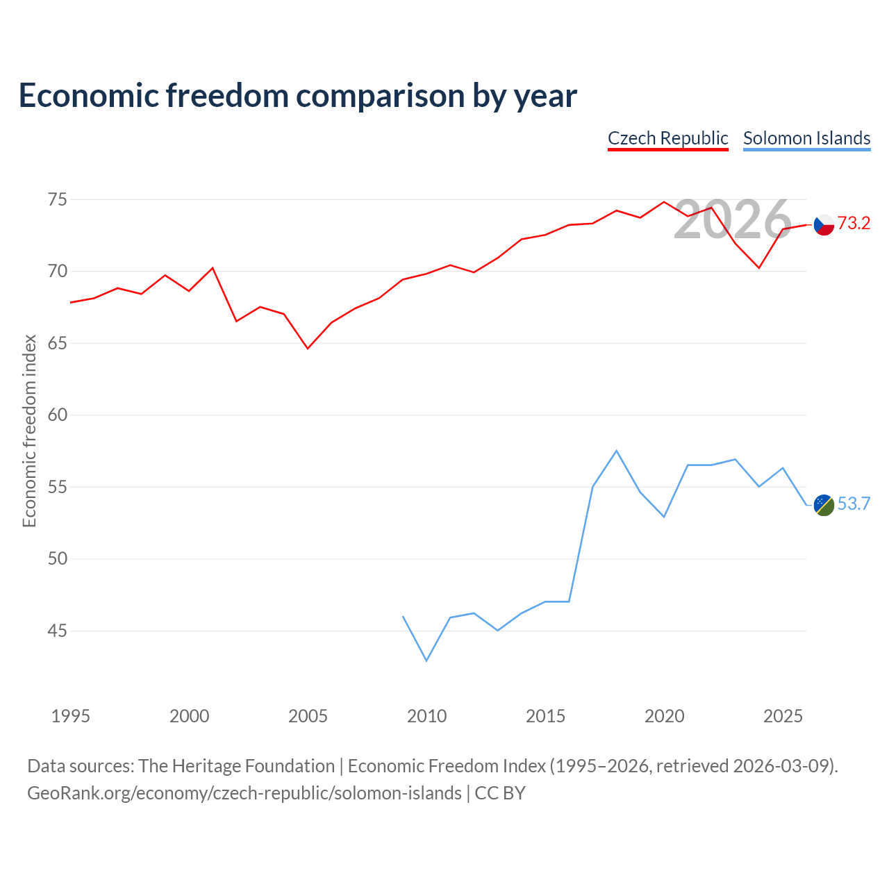 The Economic Freedom Index for the Czech Republic is 73.2, ranking 25/197, compared to 53.7 for the Solomon Islands, ranking 137/197. The chart above displays a comparison of annual changes in economic freedom indexes.