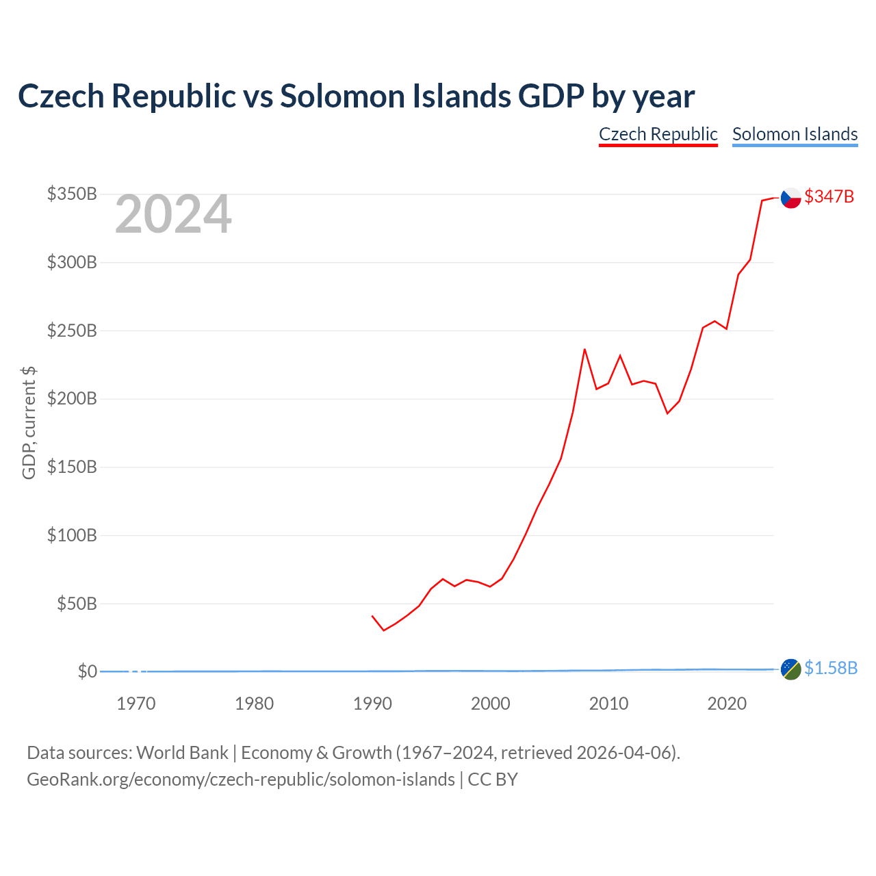 The Czech Republic has a GDP of $347B compared to $1.58B for the Solomon Islands, ranking 44/197 and 182/197 by economy size, respectively.