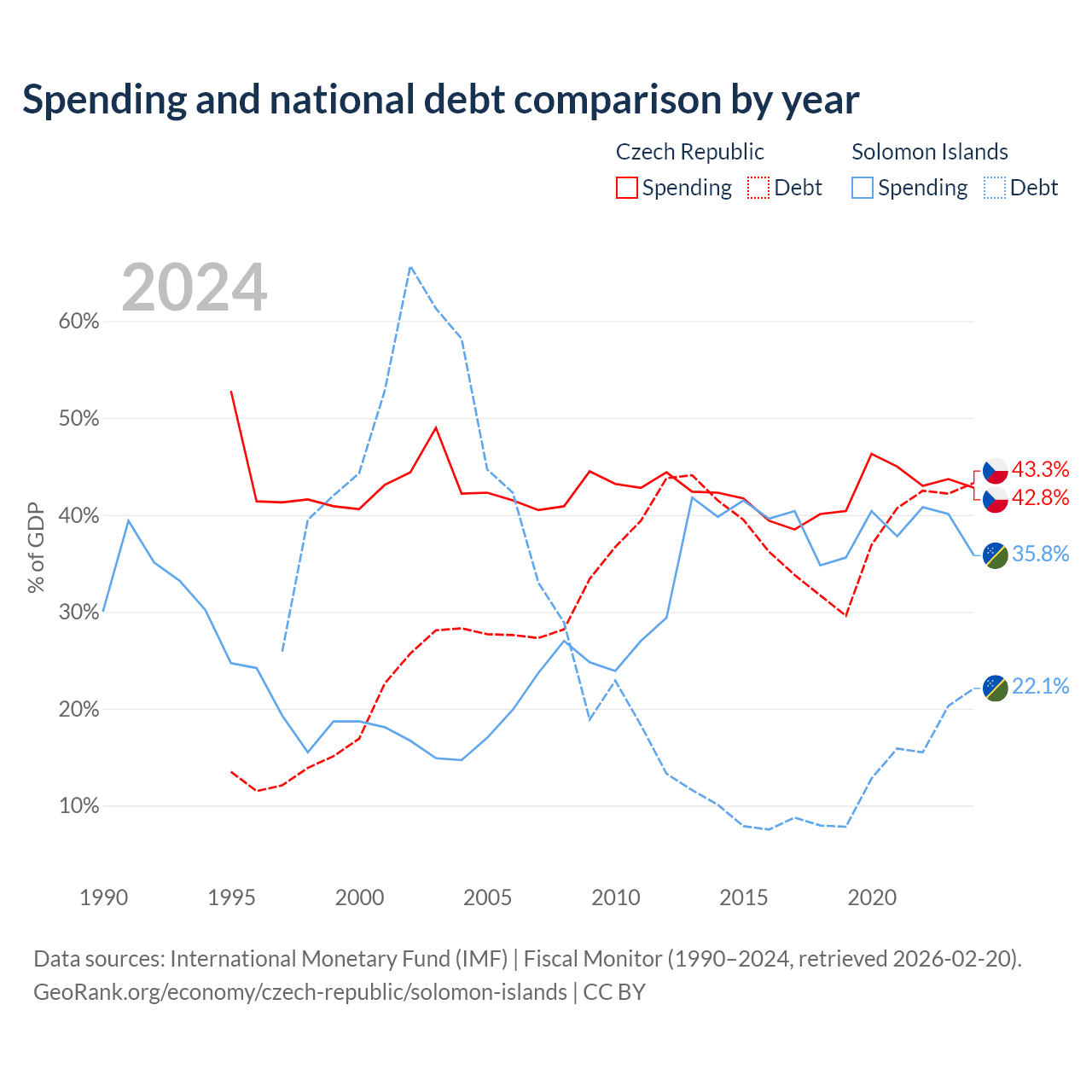 The Czech Republic has $150B in government debt (43.3% of GDP), compared to $350M (22.1% of GDP) in the Solomon Islands.