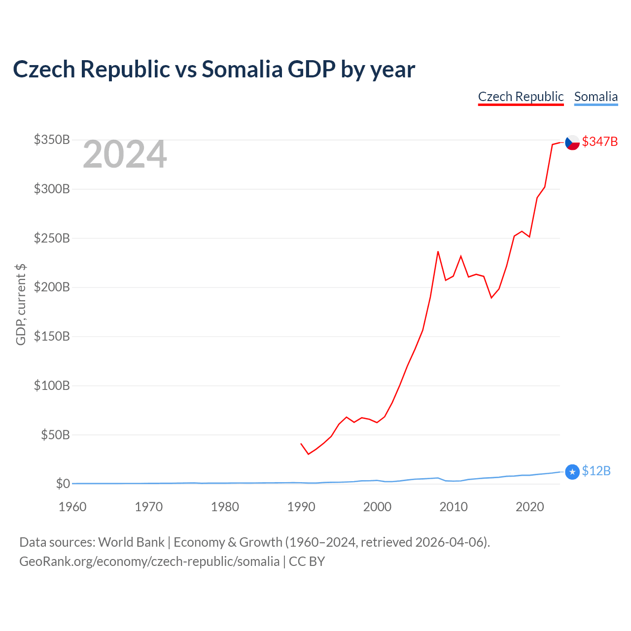 The Czech Republic has a GDP of $347B compared to $12B for Somalia, ranking 44/197 and 150/197 by economy size, respectively.