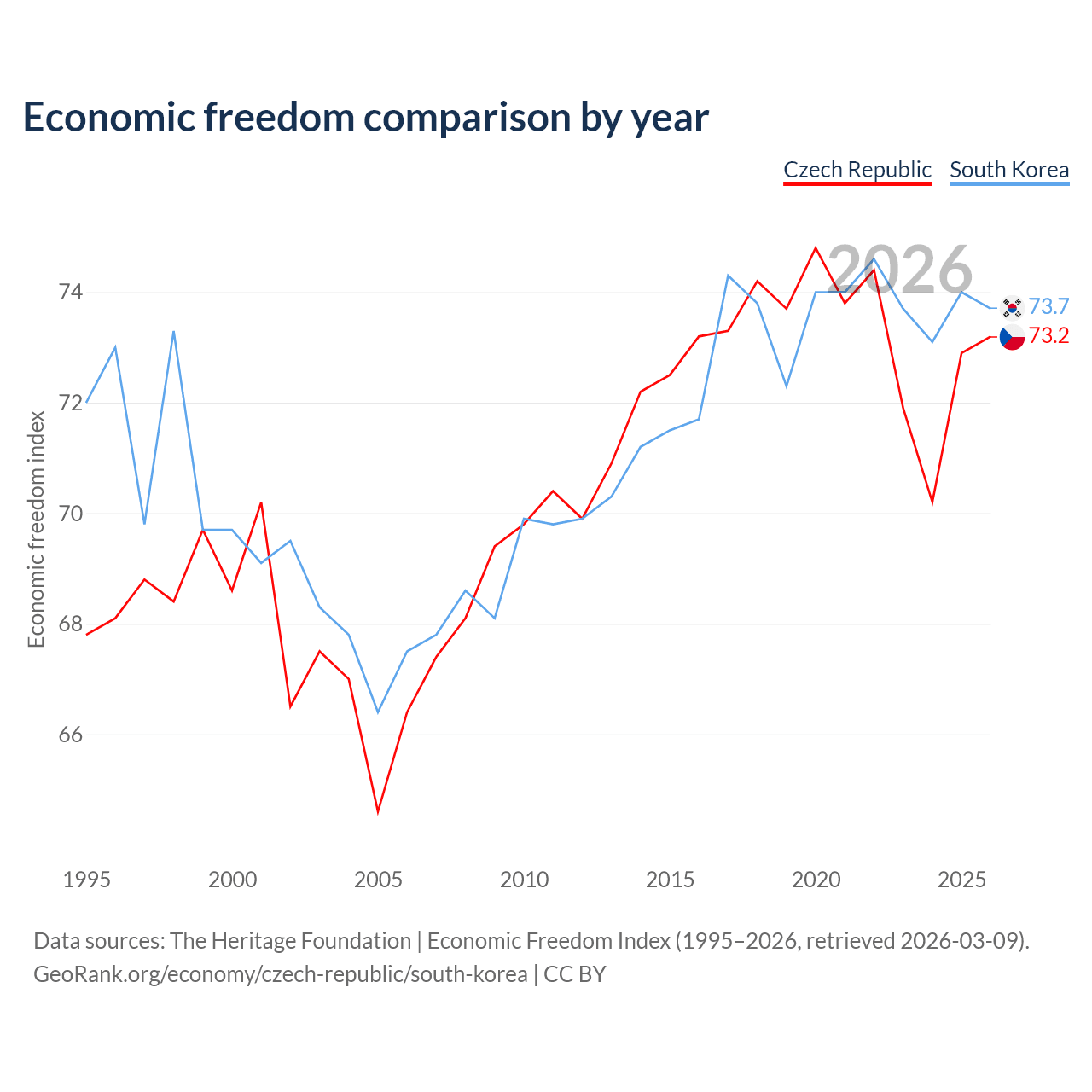 The Economic Freedom Index for the Czech Republic is 73.2, ranking 25/197, compared to 73.7 for South Korea, ranking 24/197. The chart above displays a comparison of annual changes in economic freedom indexes.