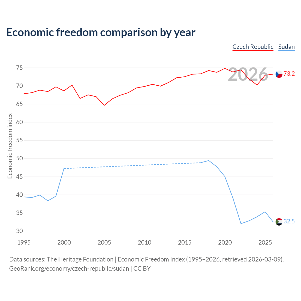 The Economic Freedom Index for the Czech Republic is 73.2, ranking 25/197, compared to 32.5 for Sudan, ranking 191/197. The chart above displays a comparison of annual changes in economic freedom indexes.