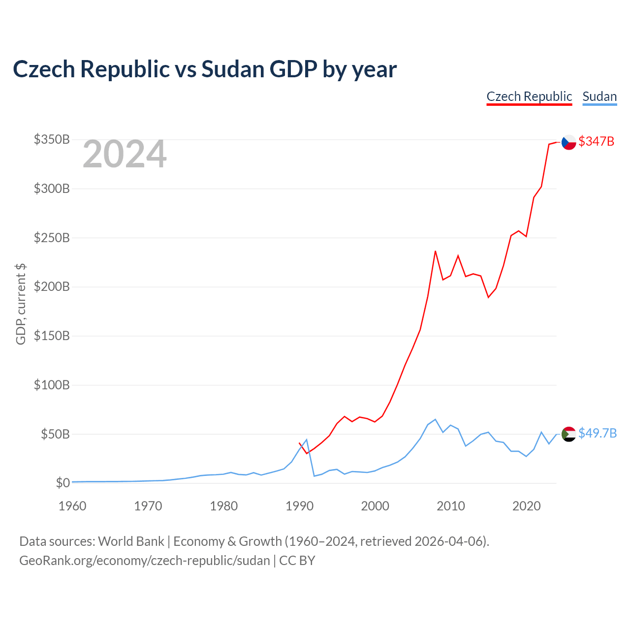 The Czech Republic has a GDP of $347B compared to $49.7B for Sudan, ranking 44/197 and 94/197 by economy size, respectively.