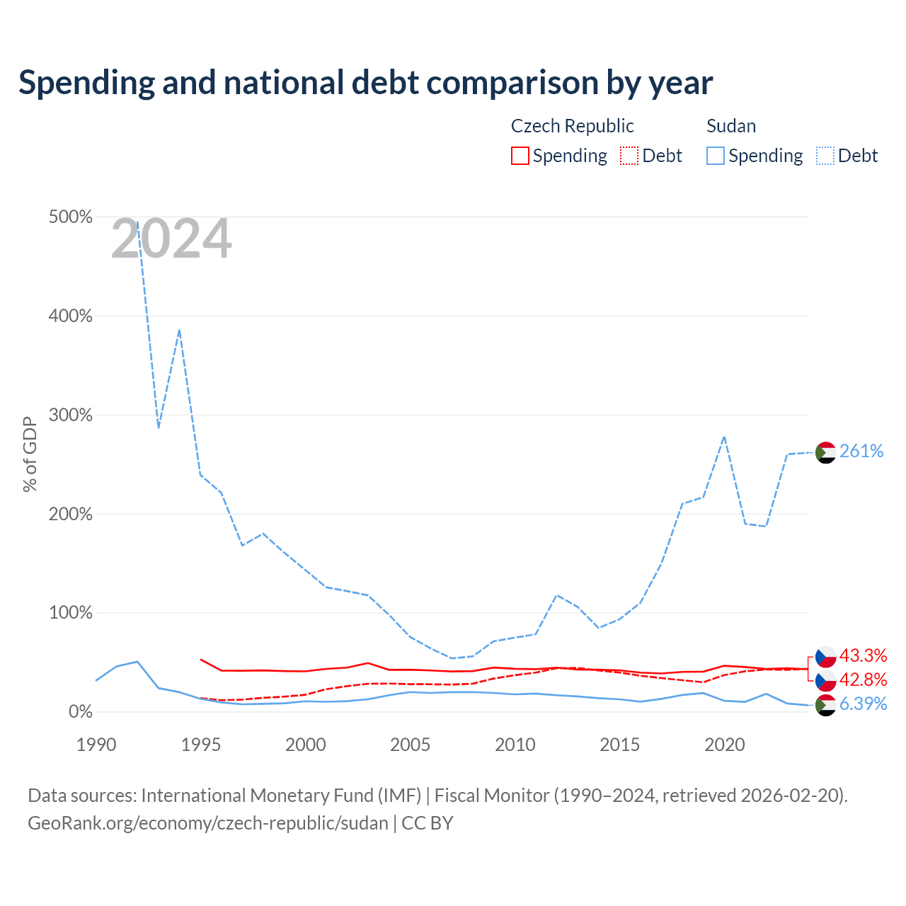 The Czech Republic has $150B in government debt (43.3% of GDP), compared to $130B (261.4% of GDP) in Sudan.
