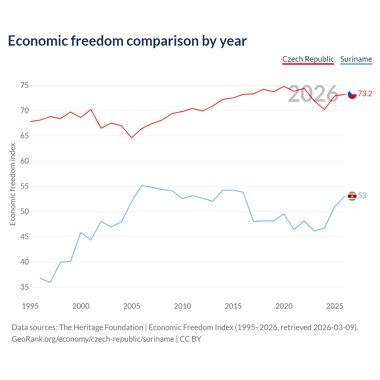 The Economic Freedom Index for the Czech Republic is 73.2, ranking 25/197, compared to 53 for Suriname, ranking 143/197. The chart above displays a comparison of annual changes in economic freedom indexes.