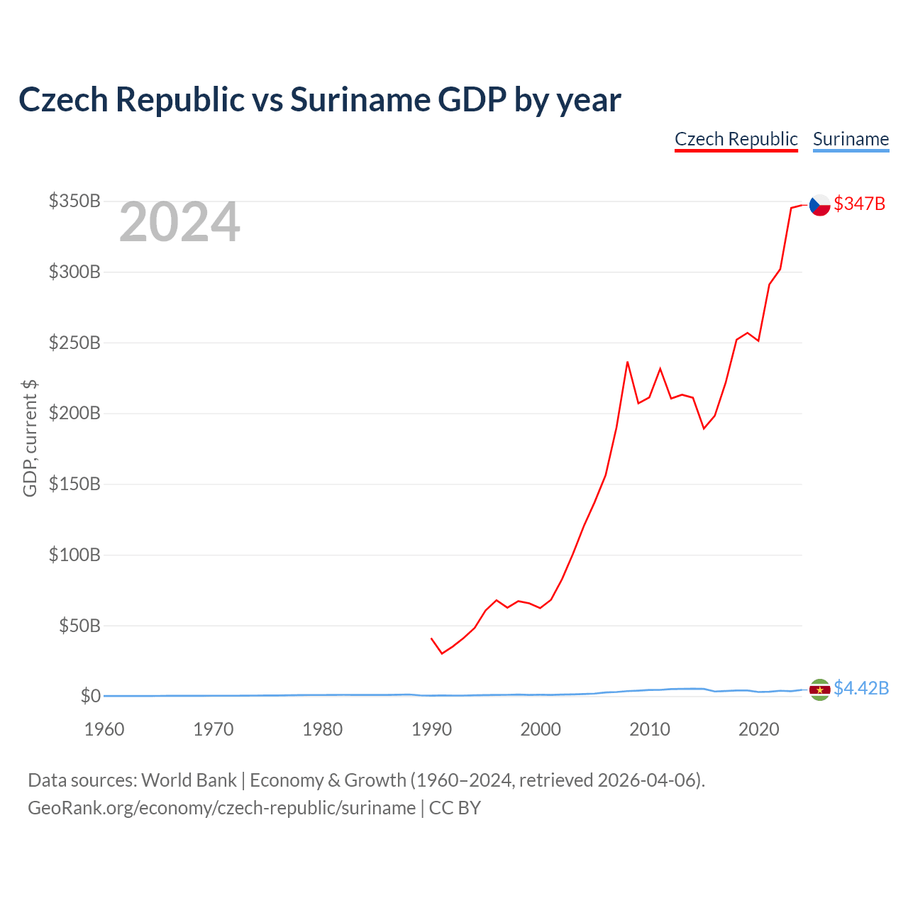 The Czech Republic has a GDP of $347B compared to $4.42B for Suriname, ranking 44/197 and 164/197 by economy size, respectively.