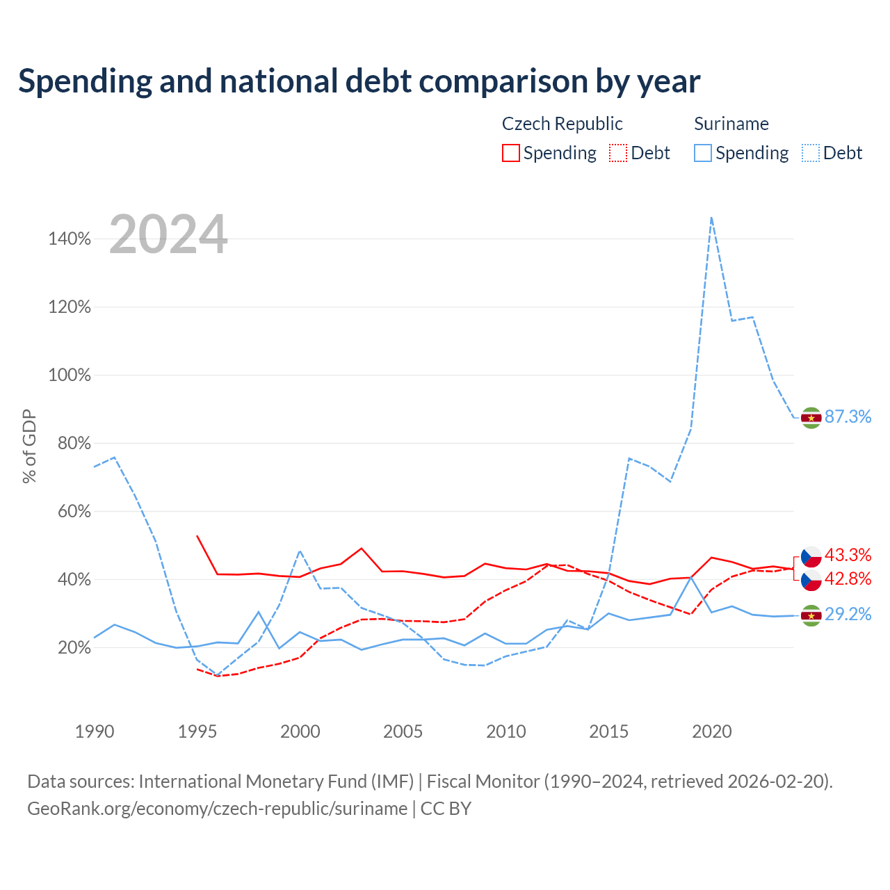 The Czech Republic has $150B in government debt (43.3% of GDP), compared to $3.86B (87.3% of GDP) in Suriname.