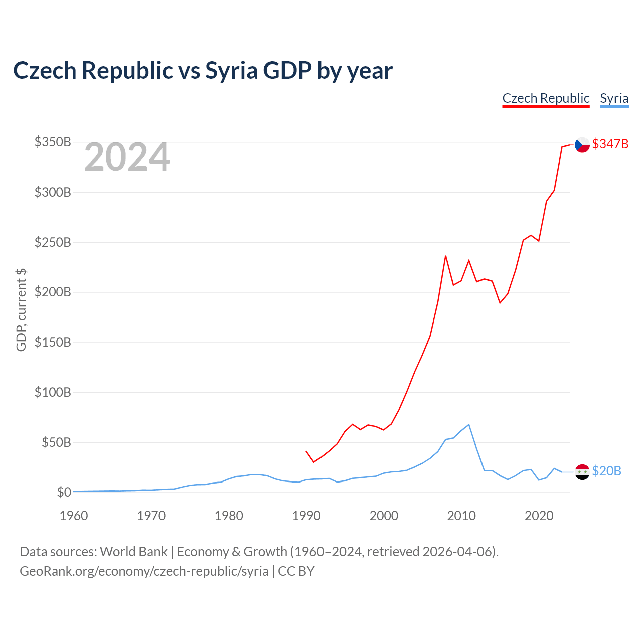 The Czech Republic has a GDP of $347B compared to $20B for Syria, ranking 44/197 and 129/197 by economy size, respectively.
