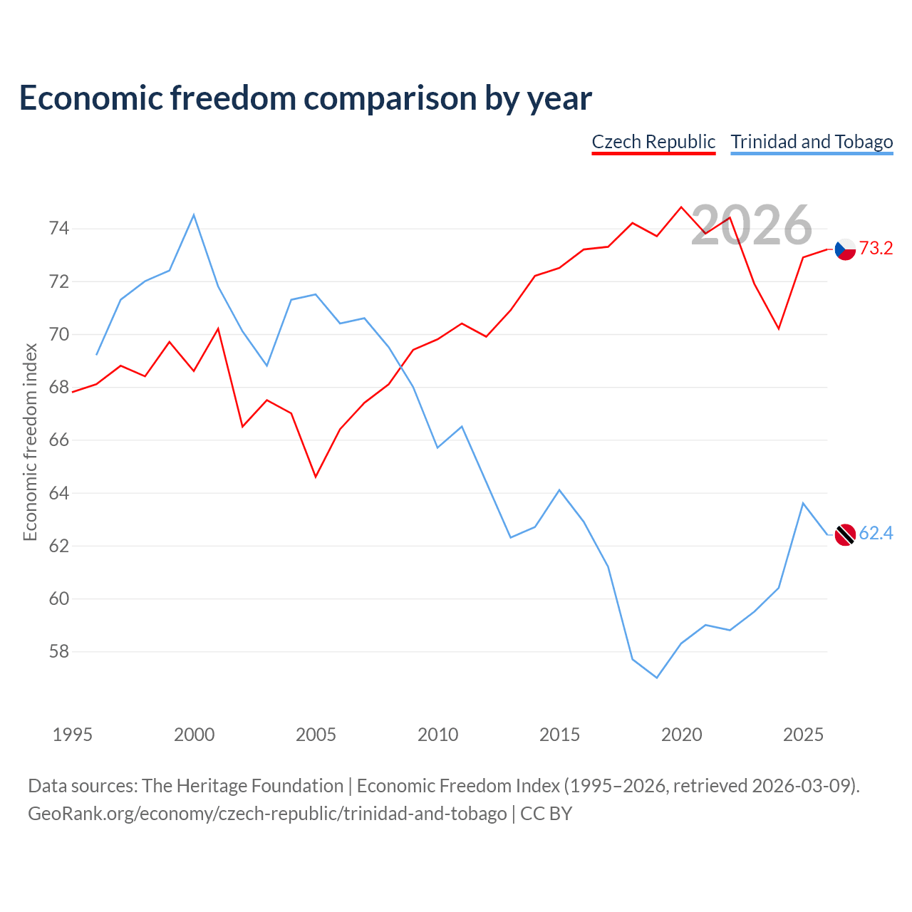 The Economic Freedom Index for the Czech Republic is 73.2, ranking 25/197, compared to 62.4 for Trinidad and Tobago, ranking 87/197. The chart above displays a comparison of annual changes in economic freedom indexes.