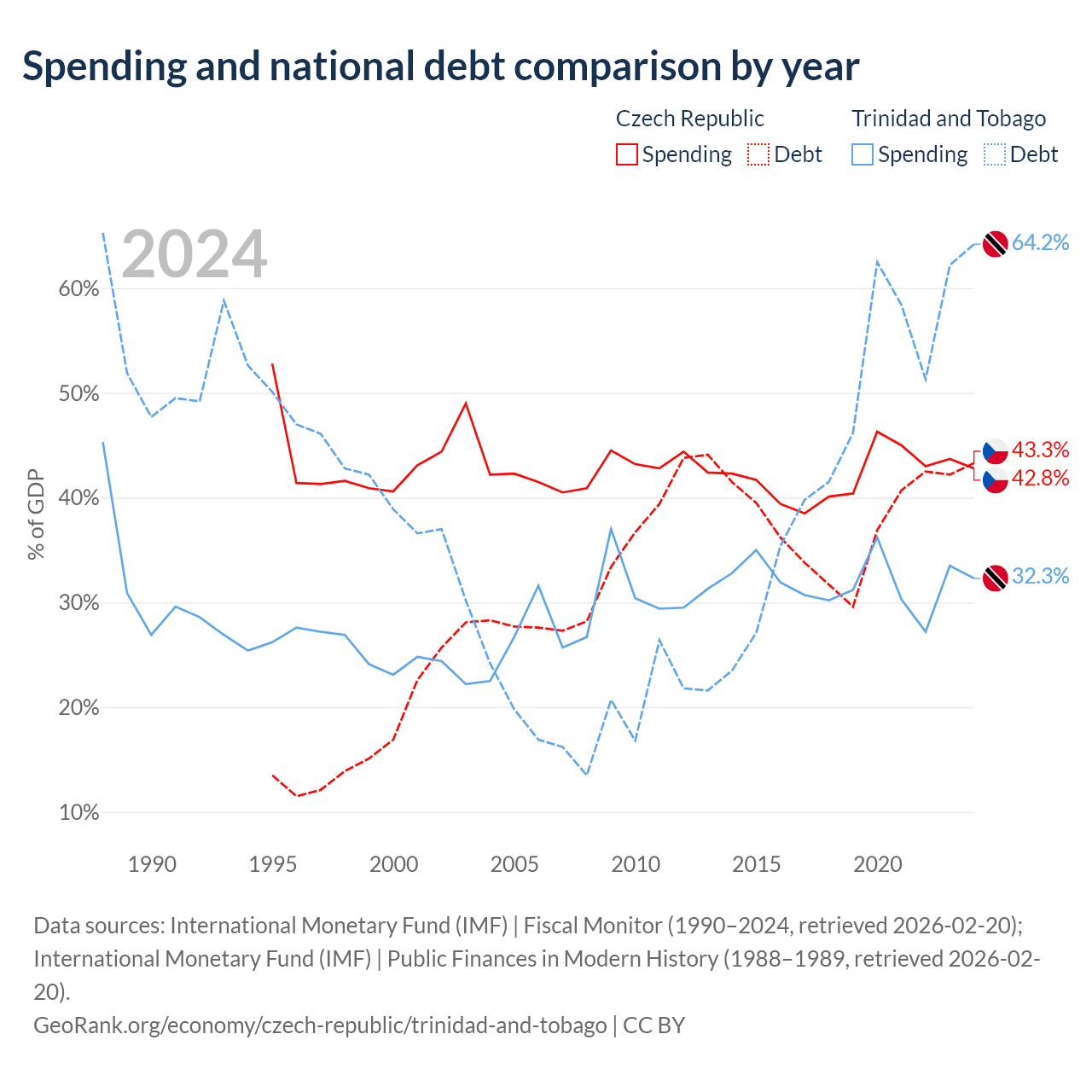 The Czech Republic has $150B in government debt (43.3% of GDP), compared to $16.5B (64.2% of GDP) in Trinidad and Tobago.
