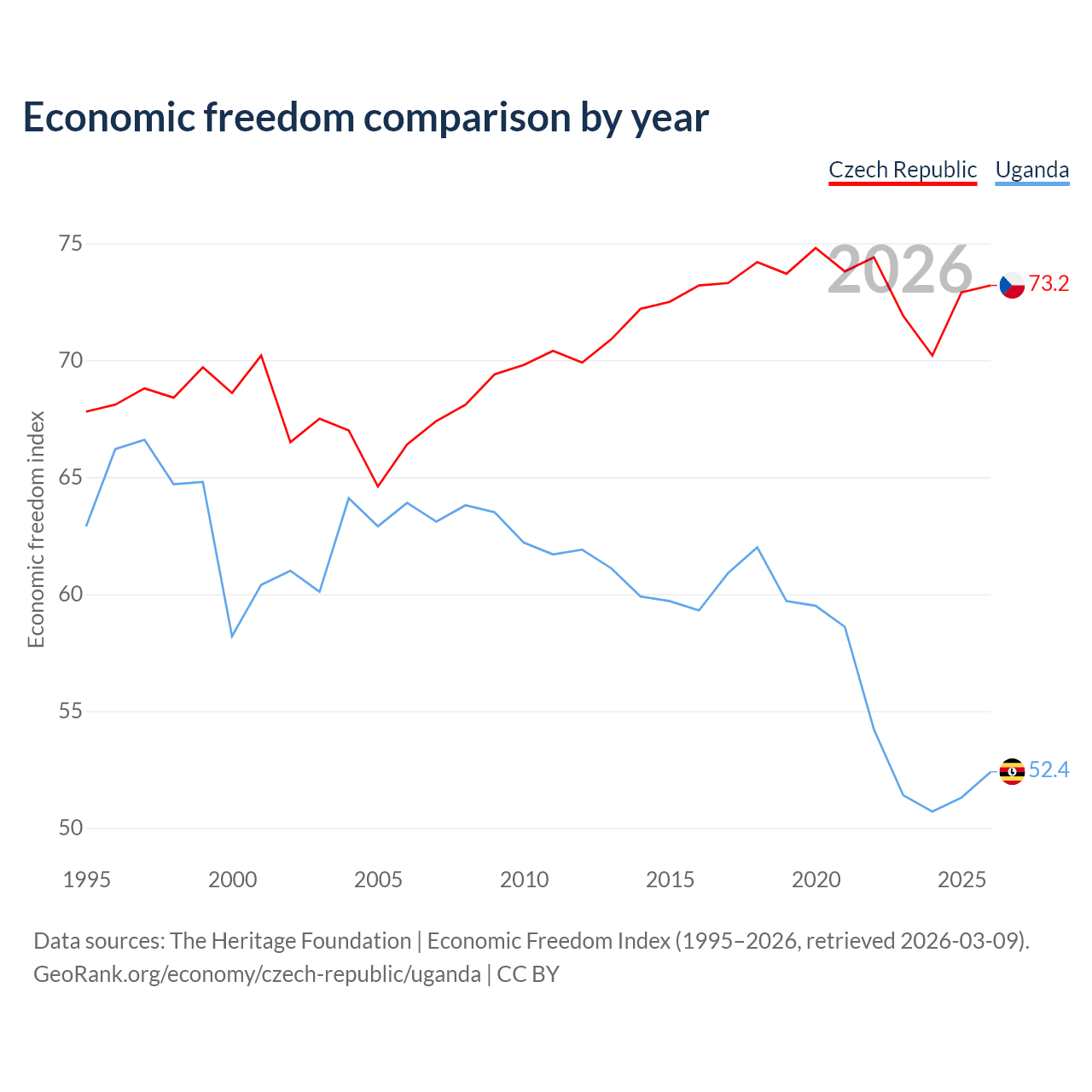 The Economic Freedom Index for the Czech Republic is 73.2, ranking 25/197, compared to 52.4 for Uganda, ranking 149/197. The chart above displays a comparison of annual changes in economic freedom indexes.