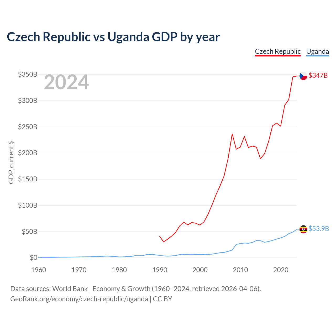 Czech Republic vs Uganda GDP by year