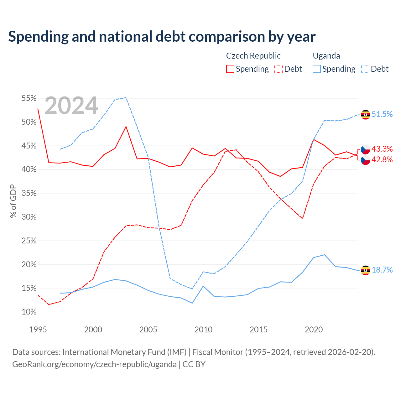 The Czech Republic has $150B in government debt (43.3% of GDP), compared to $27.8B (51.5% of GDP) in Uganda.