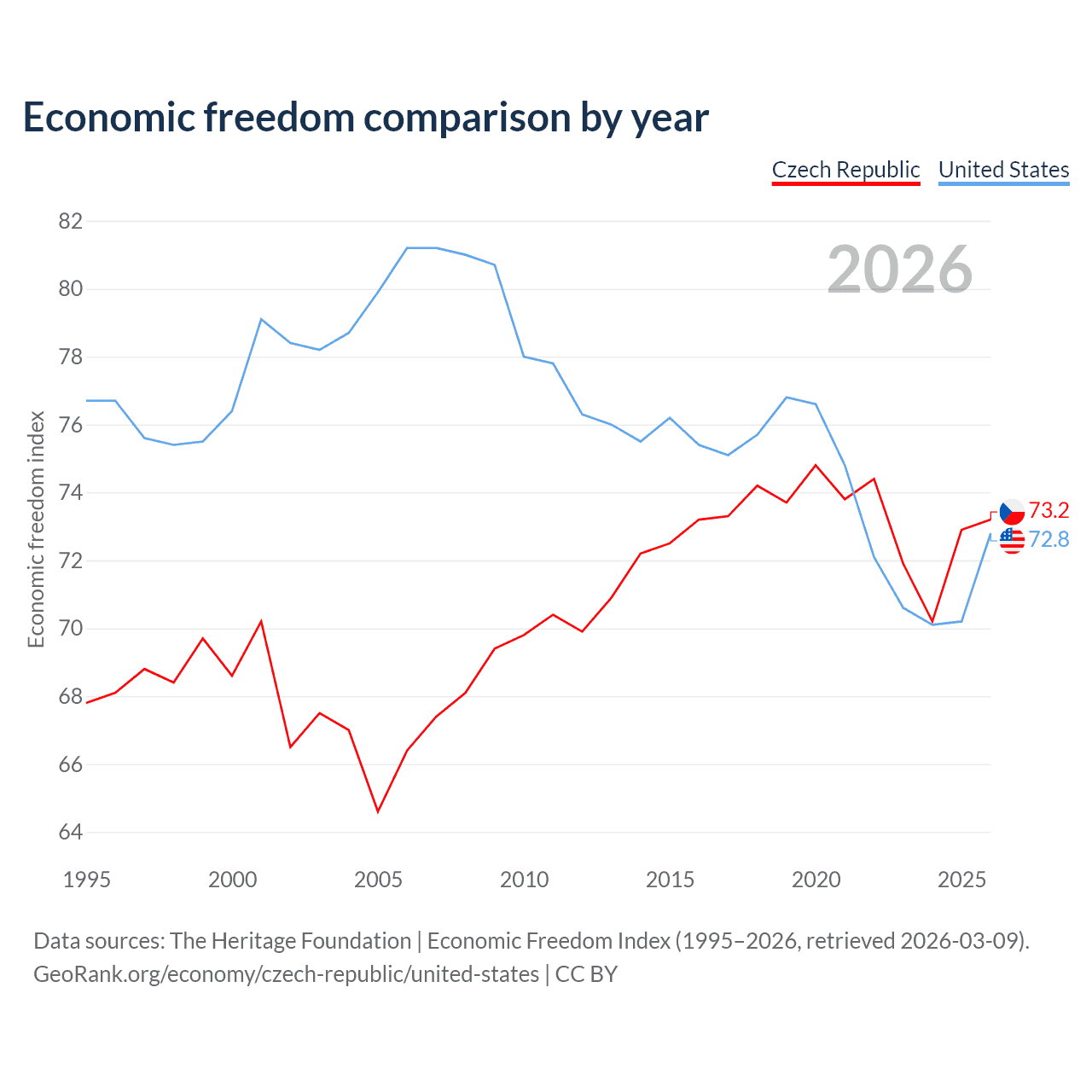 The Economic Freedom Index for the Czech Republic is 73.2, ranking 25/197, compared to 72.8 for the United States, ranking 27/197. The chart above displays a comparison of annual changes in economic freedom indexes.