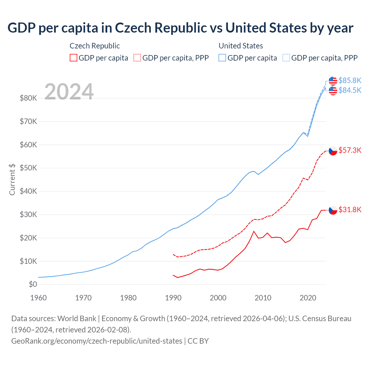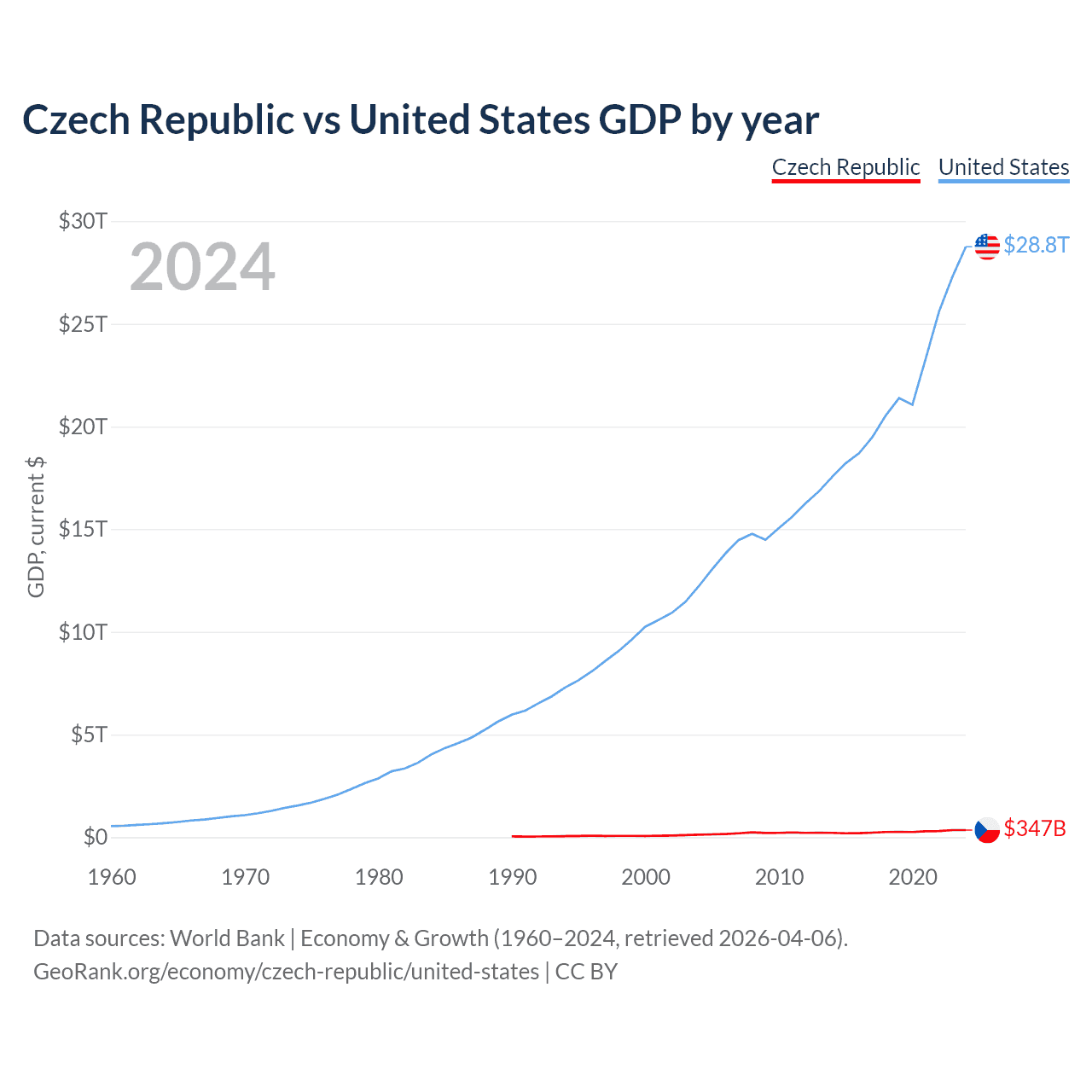 The Czech Republic has a GDP of $347B compared to $28.8T for the United States, ranking 44/197 and 1/197 by economy size, respectively.