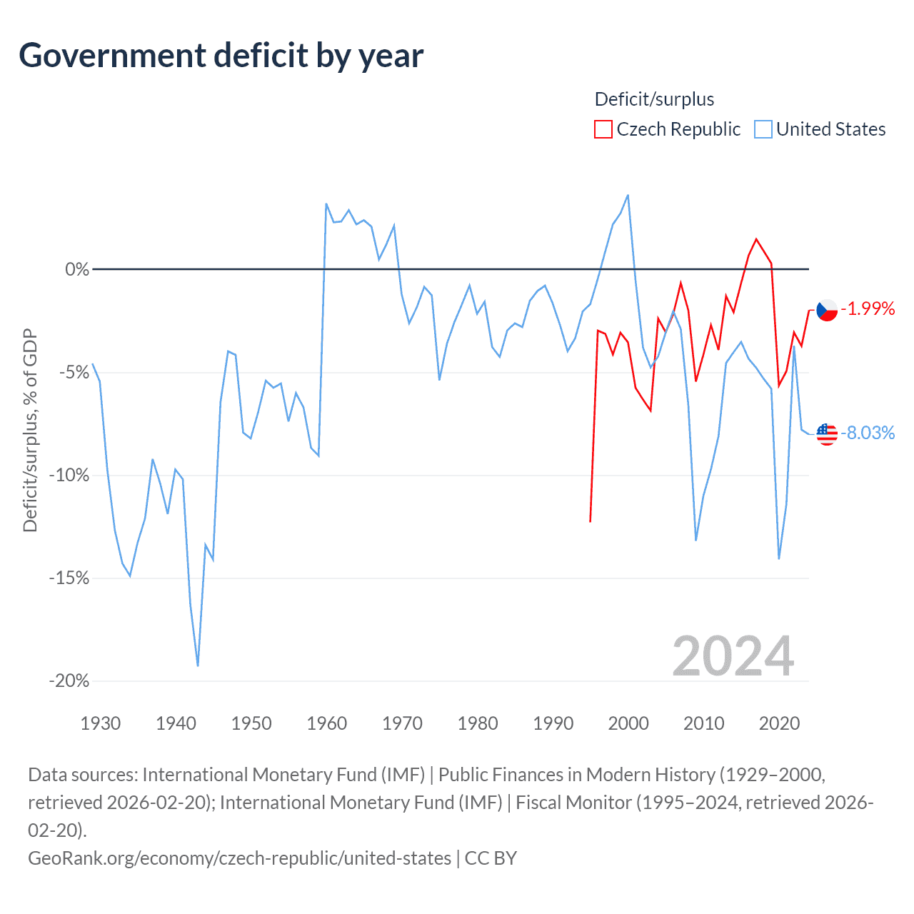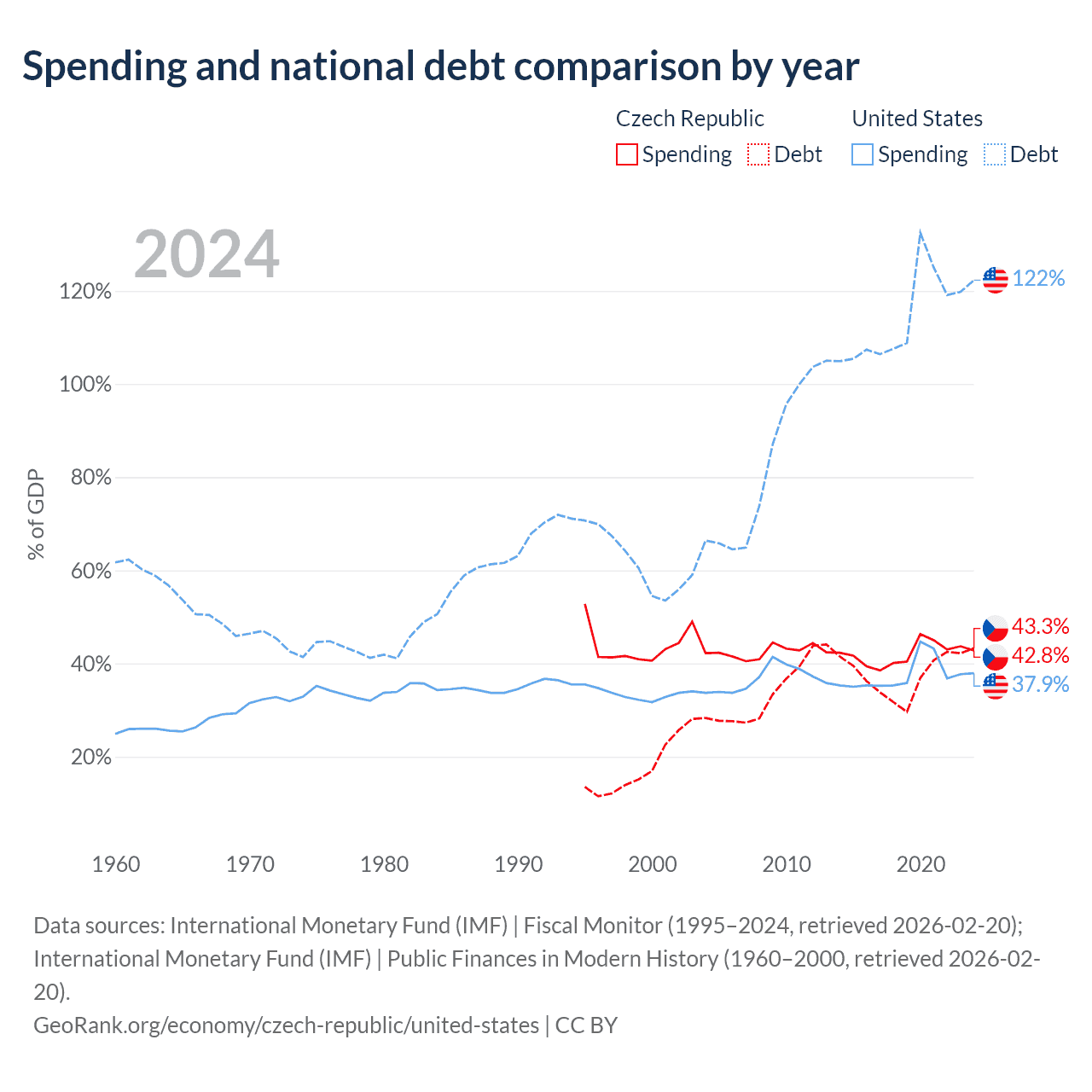The Czech Republic has $150B in government debt (43.3% of GDP), compared to $35.2T (122.3% of GDP) in the United States.