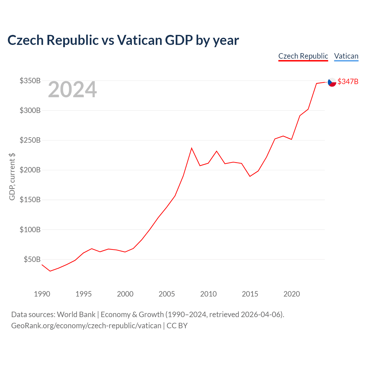 The Czech Republic has a GDP of $347B compared to $19.8M for the Vatican, ranking 44/197 and 197/197 by economy size, respectively.