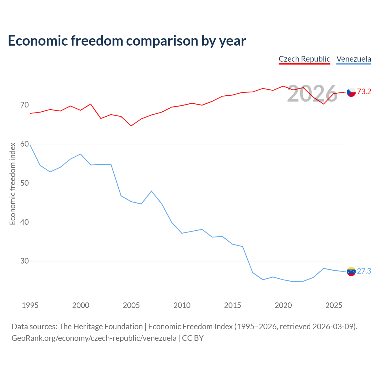 Data sources: The Heritage Foundation | Economic Freedom Index (1995–2026, retrieved 2026-03-09).