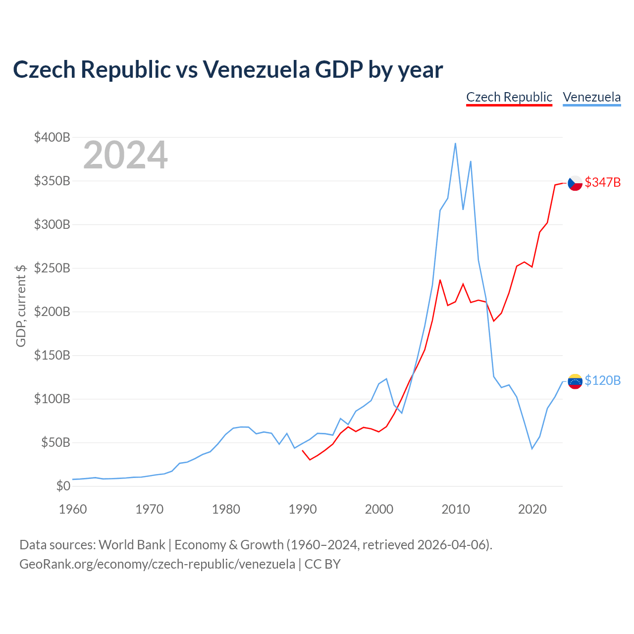 The Czech Republic has a GDP of $347B compared to $120B for Venezuela, ranking 44/197 and 65/197 by economy size, respectively.
