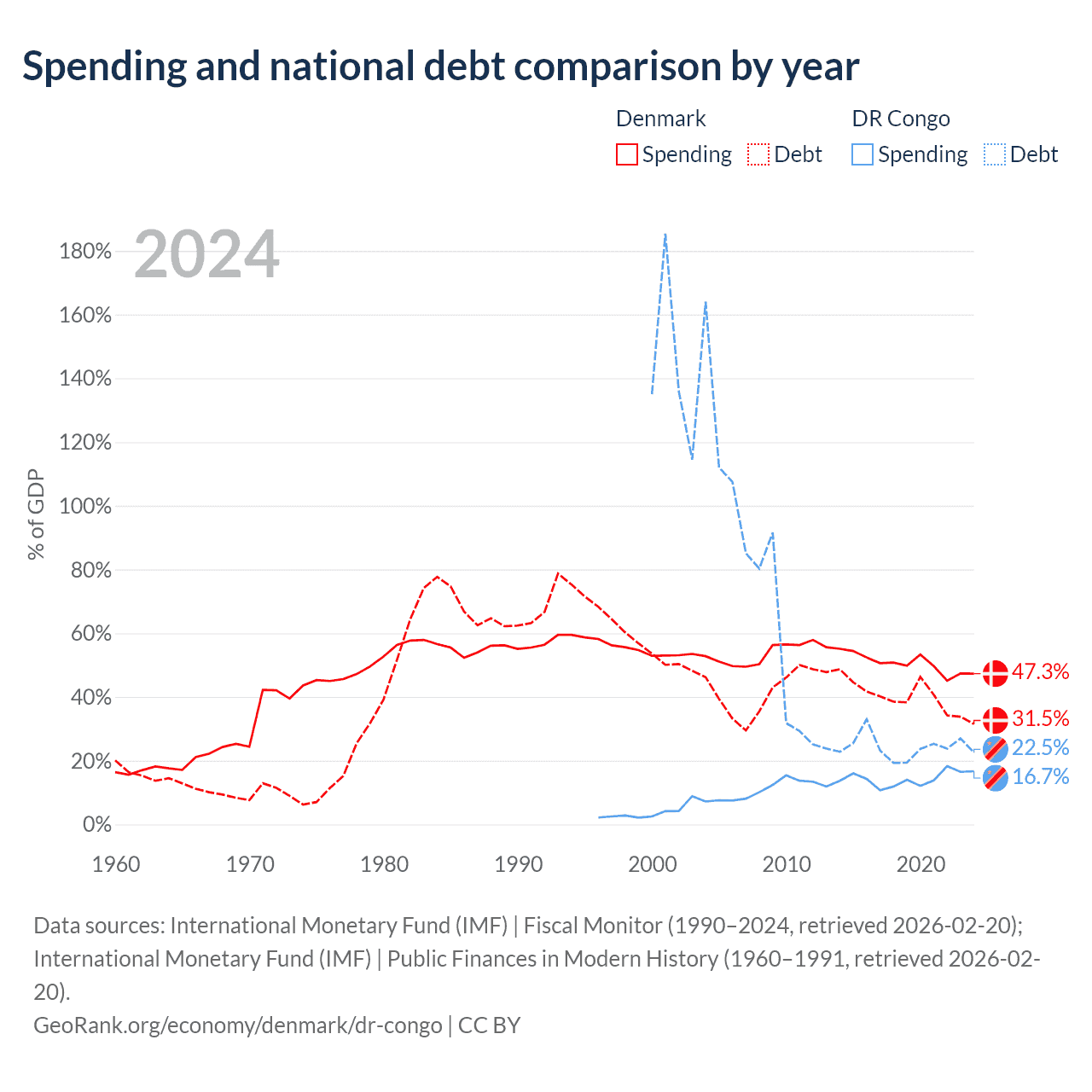 Denmark has $134B in government debt (31.5% of GDP), compared to $16B (22.5% of GDP) in the DR Congo.