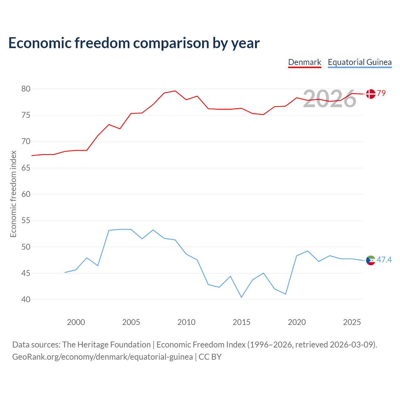 The Economic Freedom Index for Denmark is 79, ranking 8/197, compared to 47.4 for Equatorial Guinea, ranking 175/197. The chart above displays a comparison of annual changes in economic freedom indexes.