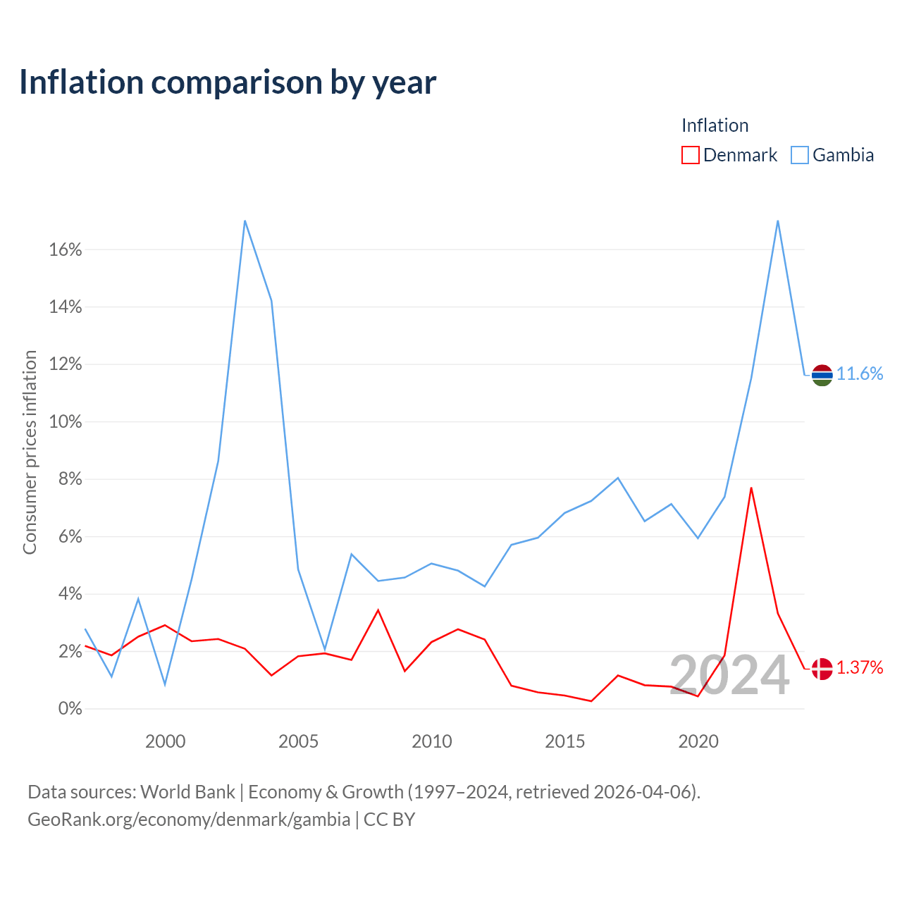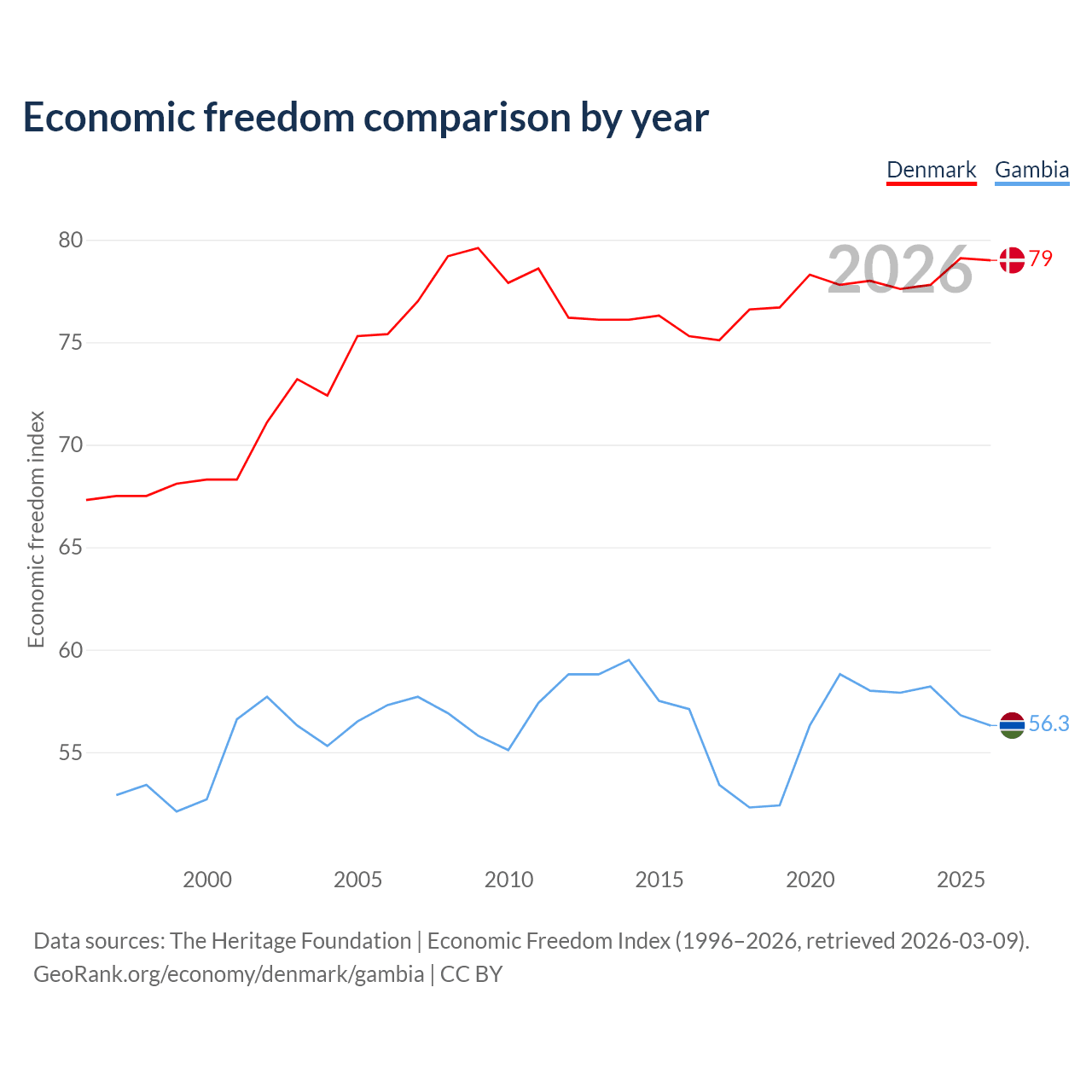 The Economic Freedom Index for Denmark is 79, ranking 8/197, compared to 56.3 for the Gambia, ranking 123/197. The chart above displays a comparison of annual changes in economic freedom indexes.