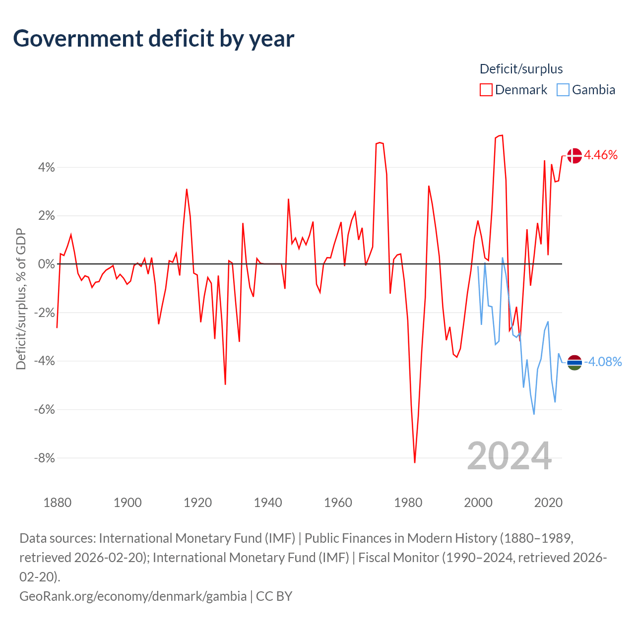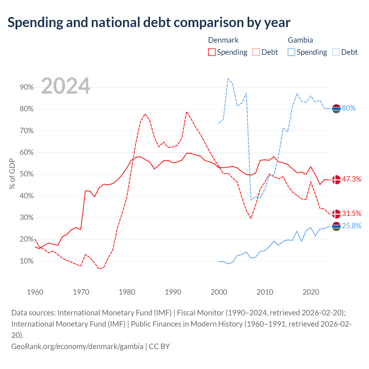 Denmark has $134B in government debt (31.5% of GDP), compared to $1.92B (80% of GDP) in the Gambia.