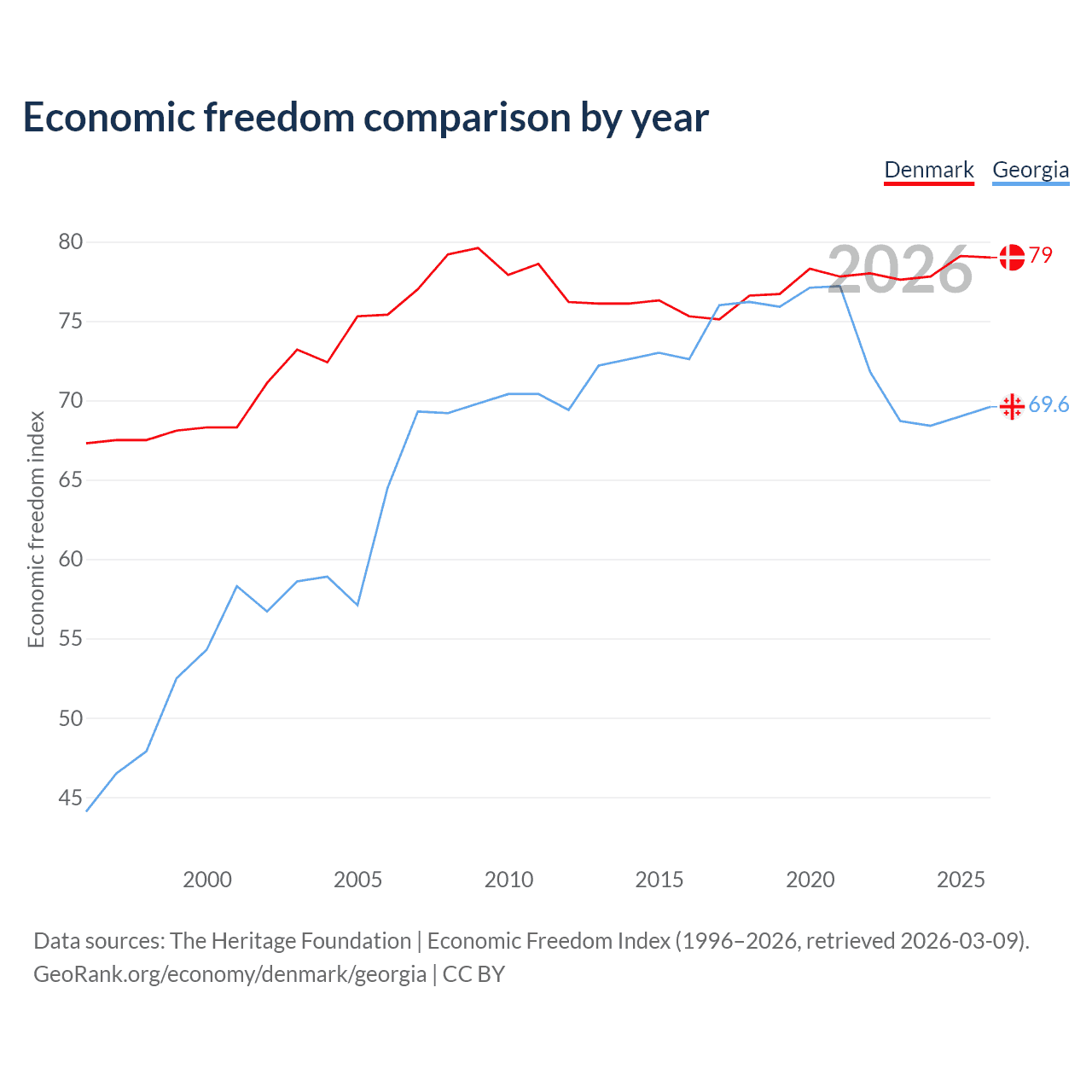 The Economic Freedom Index for Denmark is 79, ranking 8/197, compared to 69.6 for Georgia, ranking 41/197. The chart above displays a comparison of annual changes in economic freedom indexes.